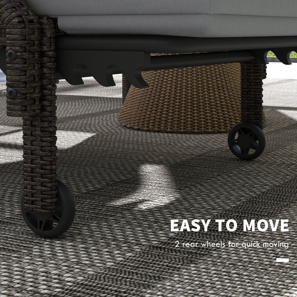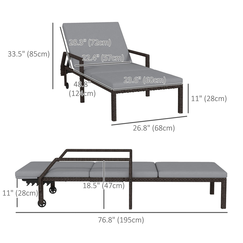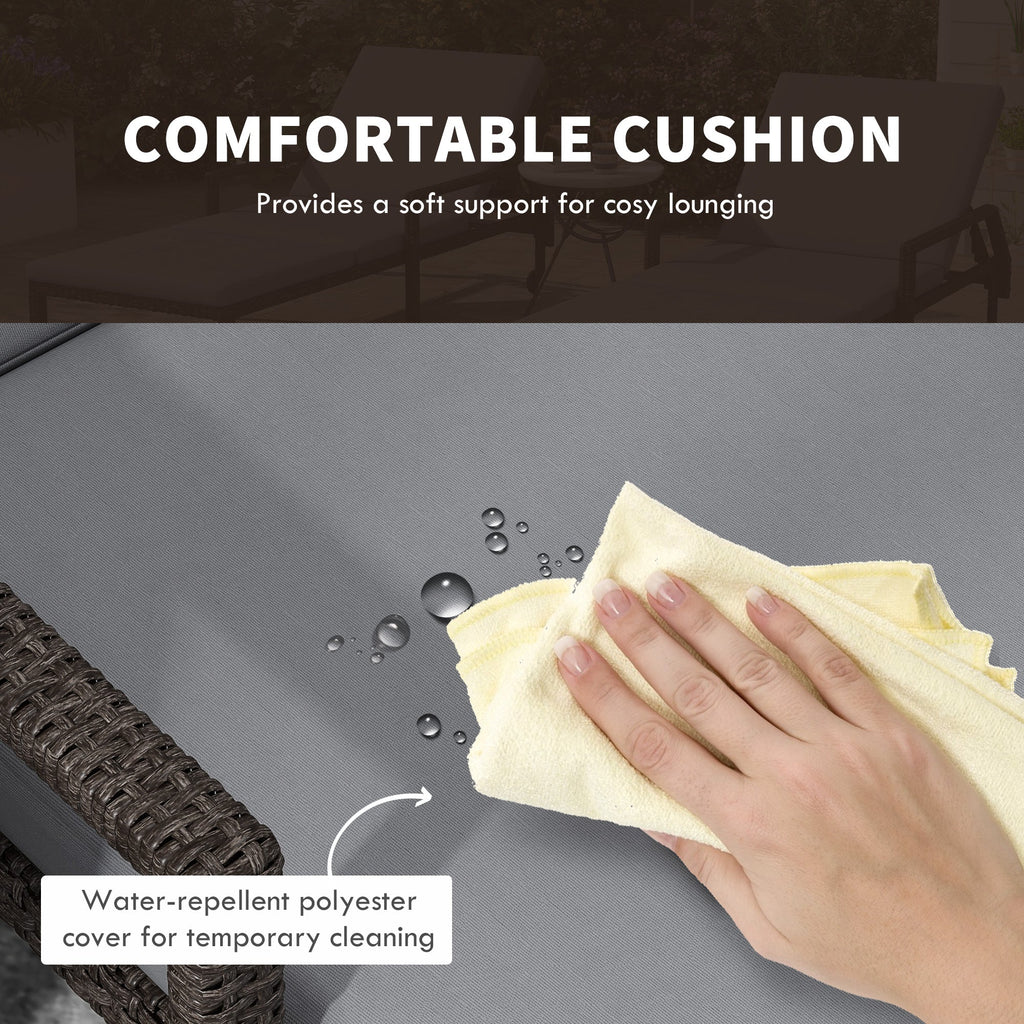 Enhance your outdoor relaxation with this set of 2 reclining wicker lounge chairs. Featuring 5 adjustable backrest levels, these chairs allow you to find your perfect lounging position, whether you're soaking up the sun or unwinding in the shade. Crafted with a sturdy metal frame and durable PE rattan wicker, this lounge chair set is built to withstand various weather conditions, making it ideal for year-round use. The chairs also include convenient armrests and two flexible wheels on each side, ensuring easy mobility across your garden, patio, or poolside. For added comfort, each chair comes with a soft, padded cushion, perfect for lounging and enjoying a relaxing afternoon in your backyard or by the pool.