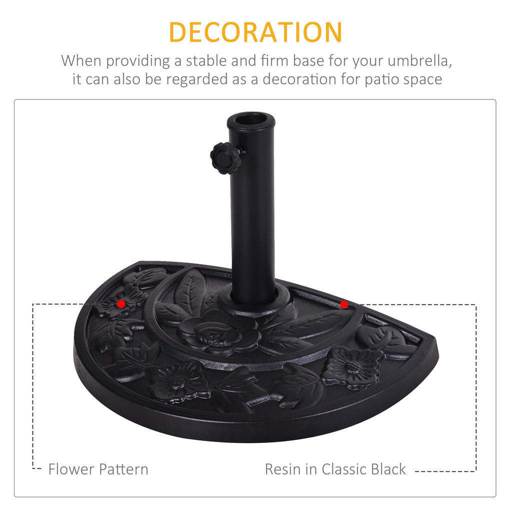 Enhance your outdoor spaces with this Classic 20" Half Round Umbrella Base, featuring an ornate flower design with a beautiful antique finish. Its space-saving shape is a practical addition to any patio, backyard, or garden area. Designed to fit half patio umbrellas, it accommodates both 1.5" and 1.9" diameter umbrella poles, making it versatile for various umbrella sizes. The base is crafted from rust-free resin, offering durability and long-lasting performance. The decorative patterns prevent chipping, peeling, and rust, while the metal pole provides strong support. For added stability, the heavy-duty design and tightening knob securely hold the umbrella in place, ensuring it stays put, even on windy days. Simply place the base against a wall or support to prevent the umbrella from tipping over.