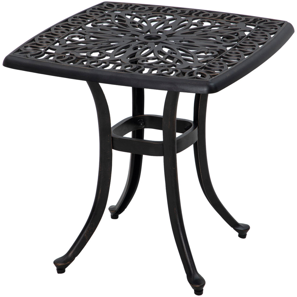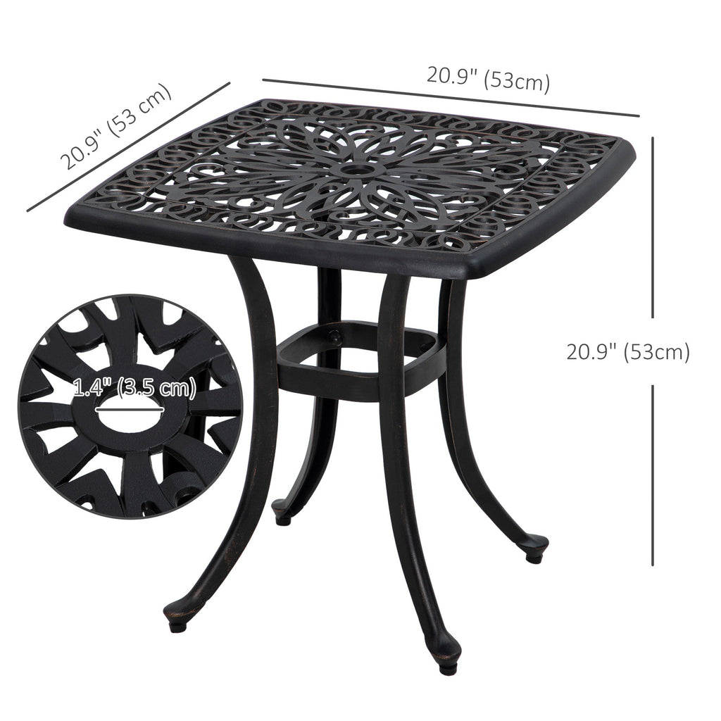 Elevate your outdoor gatherings with this Small Patio Table, crafted for durability and elegance. It features a 1.4" (3.55 cm) diameter umbrella hole, perfectly sized to accommodate a 1.38" (3.5 cm) patio umbrella pole, with an additional hole beneath the tabletop for extra umbrella stability. Constructed with a cast aluminum frame and finished with a powder-coated layer, this table is designed for lightweight, anti-rust, and water-resistant performance, making it ideal for all seasons. Its adjustable foot pads ensure stable placement on any surface, whether it’s a patio, balcony, or garden. The 20.9" x 20.9" square tabletop provides ample space for drinks, snacks, or decorative accents, while the elegant floral design and outward curved legs add a touch of charm and sophistication. Perfect for creating a cozy corner in your outdoor space.