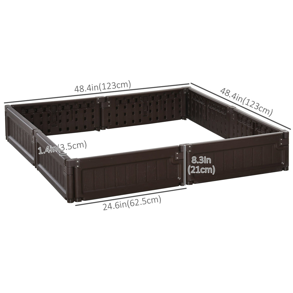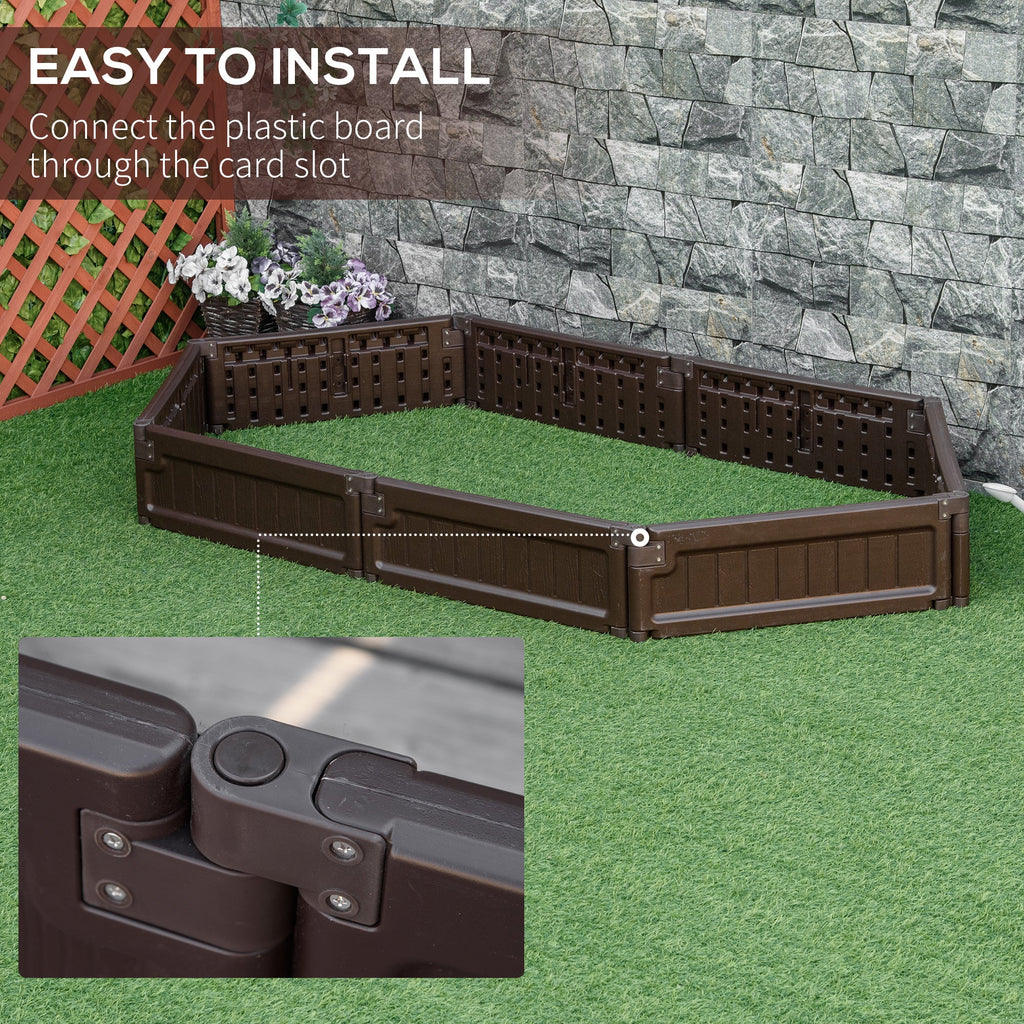 Enhance your gardening experience with the Raised Garden Bed Planter, a stylish and practical solution for growing flowers, fruits, vegetables, herbs, and more. Designed for gardeners with limited space, this planter eliminates the need to dig into your lawn. The garden bed consists of eight panels that easily connect with a board-connecting design, making it simple to assemble and disassemble for easy storage. Constructed from high-quality HDPE material with UV protection, this planter is built to withstand the elements, ensuring durability and longevity. Its imitation wood grain texture adds a natural aesthetic to your garden, while its lightweight design allows you to move it effortlessly. You can also combine multiple sets to create different shapes, such as squares or rectangles, to suit your space and needs.