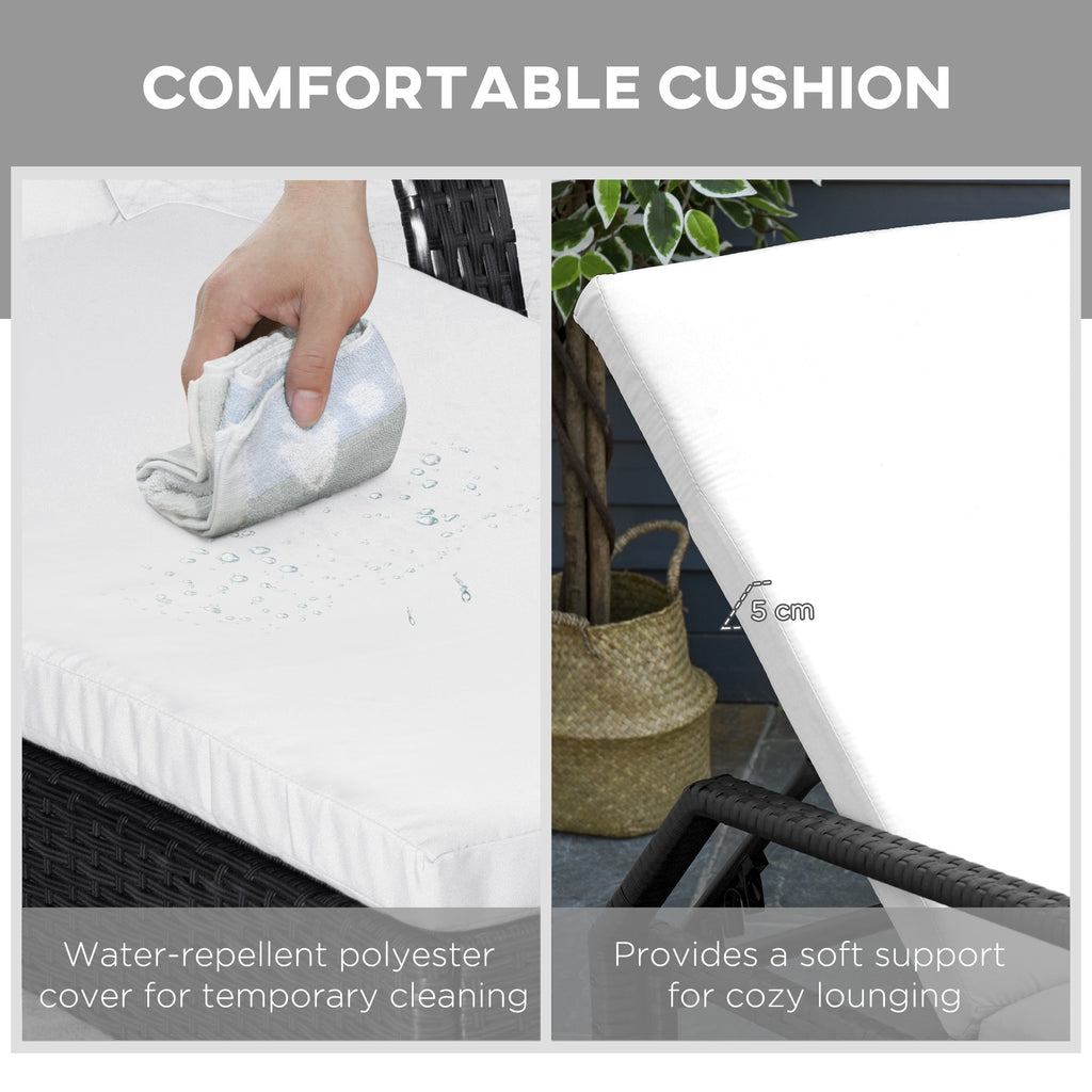 Enhance your outdoor space with the Three-Piece Outdoor Lounger Set, which includes two reclining chaise lounge chairs and a stylish side table. This set is perfect for relaxing and unwinding with a friend, featuring a tempered glass top for added safety. The solid steel frame with a powder-coated finish ensures durability, while the robust PE rattan wrap can withstand all weather conditions. Enjoy the comfort and versatility of adjustable reclining backrests, which can be set to five different angles (11.8" to 40.6" / 30-103 cm) to suit your preference. Thoughtfully designed armrests enhance comfort, and the integrated bottom wheels allow for easy portability. Cozy cushions and headrest pillows ensure you remain comfortable throughout your outdoor experience, whether you're sunbathing, reading, or simply relaxing by the pool. This set also includes a side table with a tempered glass surface for easy cleaning and convenience.
