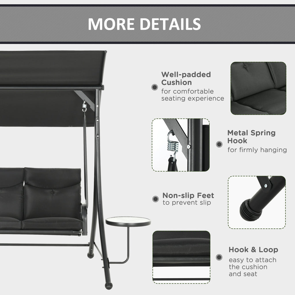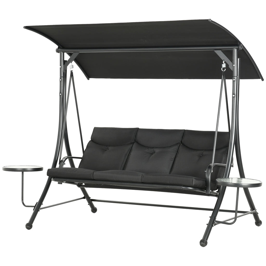 Relax and unwind with the 3-Seat Swing with Canopy, designed to comfortably accommodate up to three people. This spacious porch swing features an elegant arc-shaped design, extra-thick cushioned seats, and a durable, adjustable polyester canopy with a PE coating to provide ample shade during warm days. Whether you place it in your backyard, patio, garden, or porch, it makes an ideal outdoor swing chair for enjoying leisure time with friends or family. For added convenience, glass coffee tables are integrated on both sides, providing a perfect spot for drinks or snacks. The swing's solid steel frame ensures long-lasting support and durability, making it a perfect addition to your outdoor oasis.