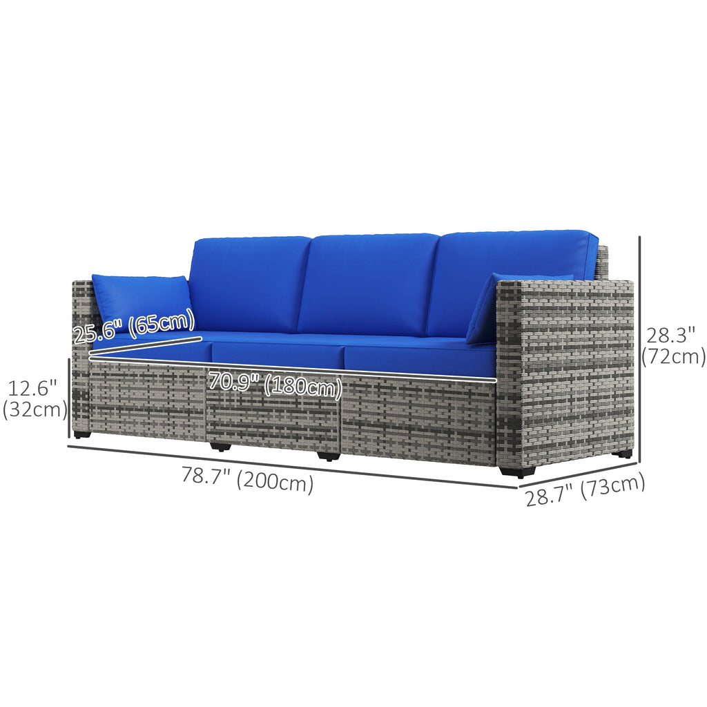 Upgrade your outdoor living space with this stylish and comfortable three-seater PE rattan wicker patio sofa. Designed for socializing, movie nights, or casual relaxation, this outdoor couch is a perfect fit for patios, decks, balconies, conservatories, gardens, and more. Built for durability, it features a galvanized steel frame with a powder-coated finish, wrapped in handwoven twin half-round PE rattan that is easy to clean and resistant to UV rays and light water damage. Adjustable foot pads provide balance and protect flooring. The thickly padded seat and back cushions offer exceptional comfort, and their zippered covers make them easy to remove and wash. Assembly is simple with the included hardware and instructions, taking just about 30 minutes with two people. For prolonged use, it is recommended to cover the sofa when not in use.