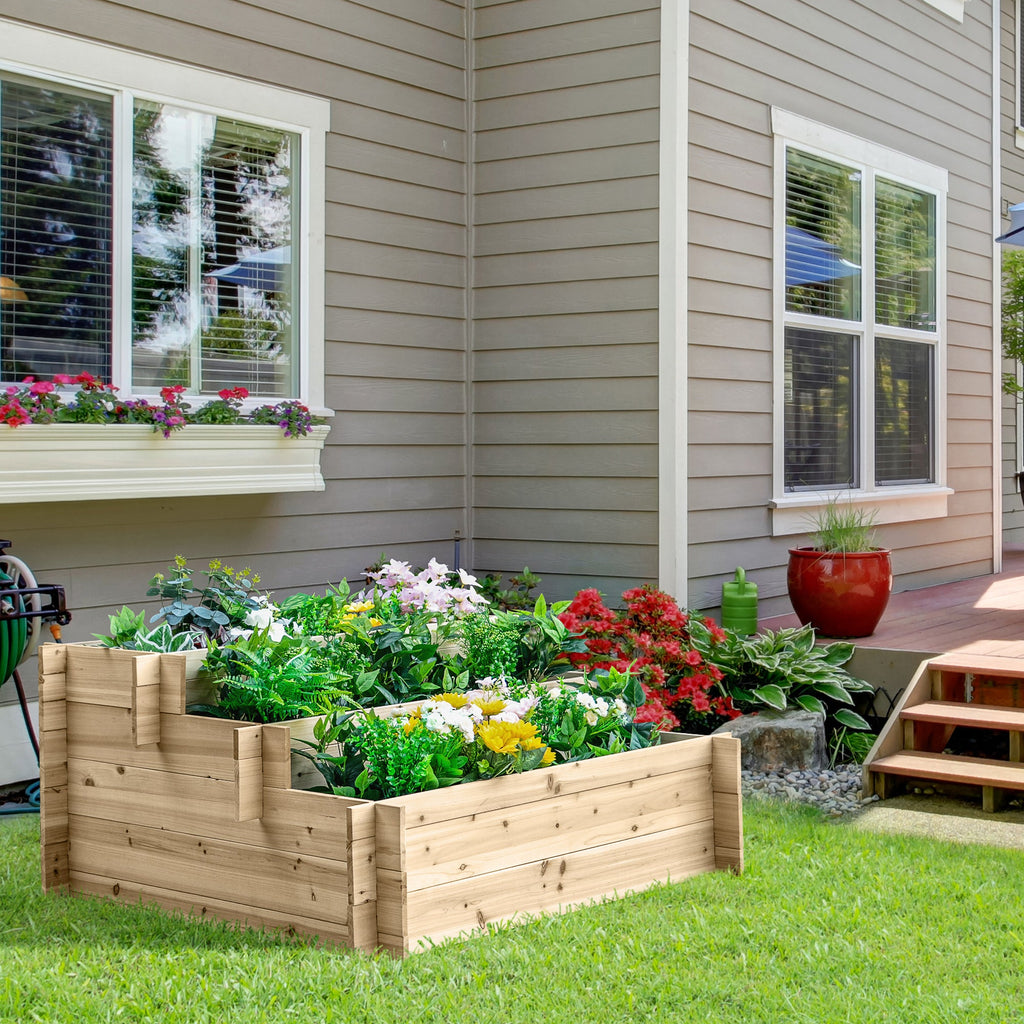 Enhance your gardening experience with this elevated garden planter, designed to keep your vegetables, herbs, flowers, and other plants neatly organized. Its tiered stair-step design offers three different depths, making it ideal for accommodating plants of various root lengths and sizes. Whether you have a small balcony, a lush backyard, or a charming front yard, this raised garden bed adds a decorative and functional touch to any space. Crafted from natural fir wood, this planter is highly durable and resistant to breakdown, ensuring long-term use without the need for chemical treatments. The untreated wood preserves its natural beauty, making it safe for growing edible plants. Its innovative cross-halving joint structure allows for tool-free assembly, providing a hassle-free setup. Measuring 47.2 inches in length, 39.4 inches in width, and 21.3 inches in height, this spacious garden bed offers ample room for diverse plant arrangements, making it a perfect choice for both novice and experienced gardeners.