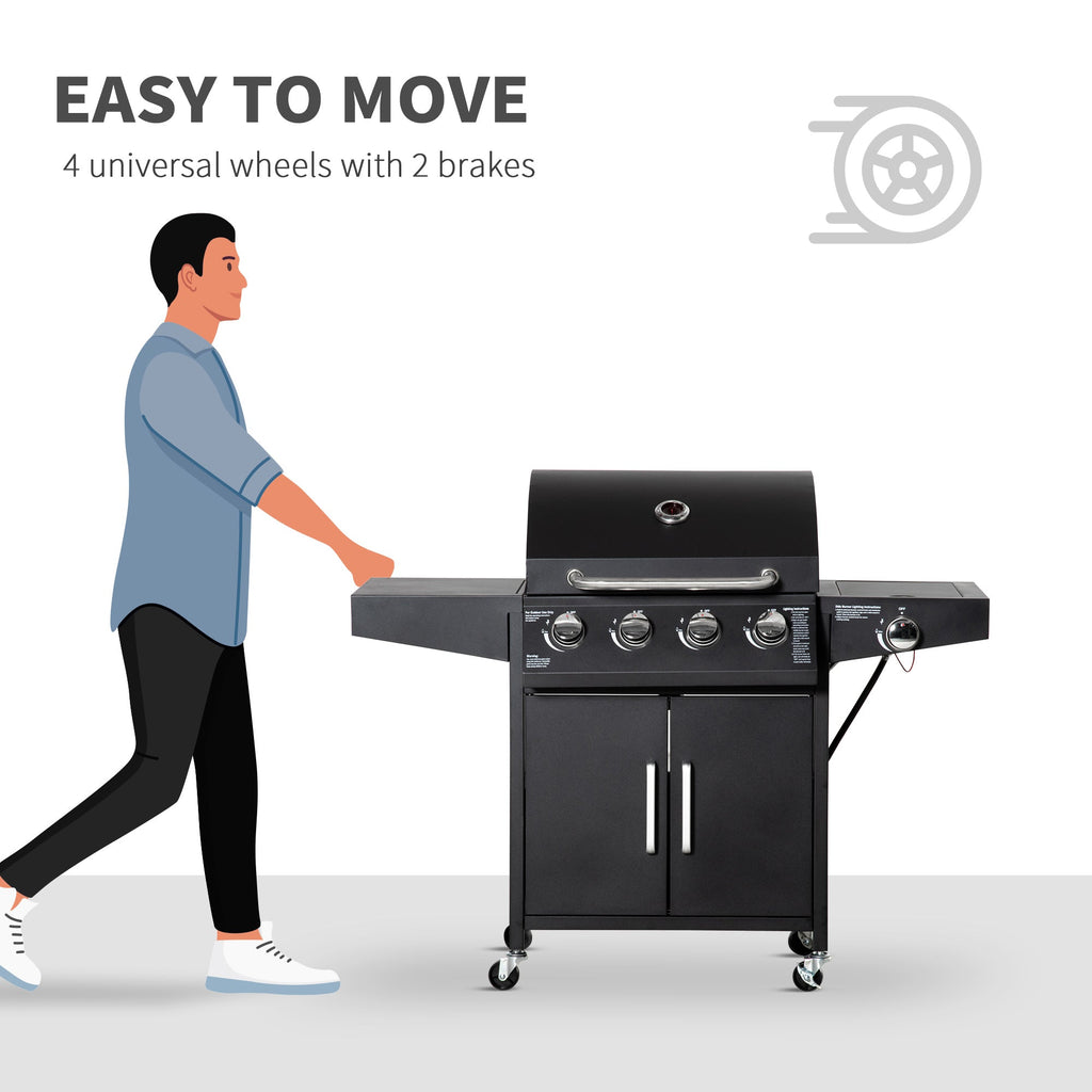 Fire up the ultimate backyard cookout with this powerful 4 + 1 Gas BBQ Grill, designed to handle everything from casual family dinners to lively weekend gatherings. Featuring four main burners and one side burner, this grill provides an impressive 380 square inches of cooking space along with a warming rack—perfect for preparing up to 15 burger patties or serving 5–10 hungry guests at once. Each burner is equipped with individual piezo ignition, allowing for precise heat control and flexibility while cooking. The large lid helps to trap heat for smoking, while the built-in thermometer on top makes it easy to monitor internal temperatures for perfect grilling results. A spacious side shelf offers room to hold plates, utensils, or seasonings for hassle-free meal prep. Built for durability, this grill boasts a sturdy carbon steel frame and stainless steel burners to withstand the elements and regular use. Four wheels—two with brakes—make it easy to roll the grill wherever you need it and lock it securely in place. Measuring 52.25" L x 21.75" W x 43" H, this freestanding gas BBQ includes a regulator and hose, so you're ready to grill right out of the box.