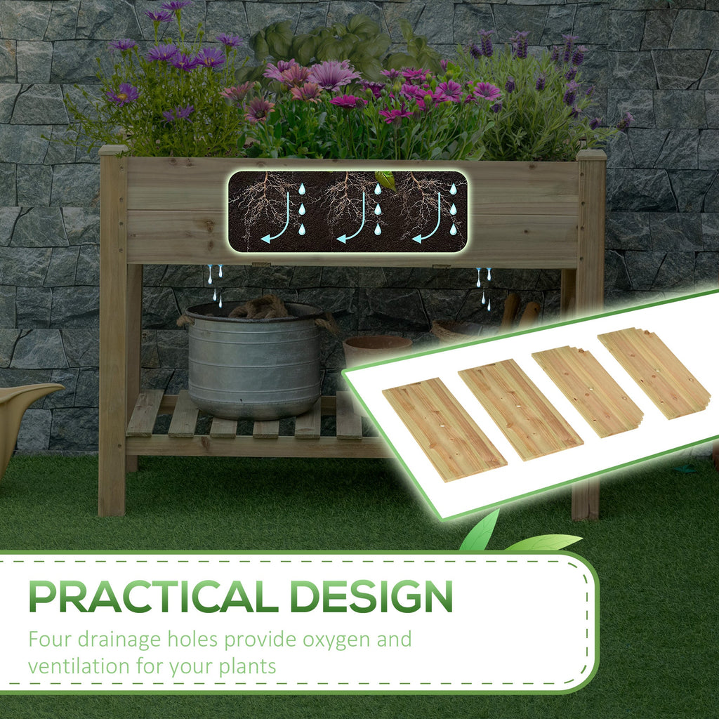 This 2-tier raised garden bed with legs is the perfect solution for anyone looking to grow plants in small spaces. It features two tiers: the upper tier for planting and the lower built-in storage shelf for organizing your gardening tools and accessories. The thoughtful design includes a gap between the bottom plates to allow for proper drainage, ensuring your plants stay healthy. At a height of 33 inches, this raised planter allows you to care for your plants without bending over, reducing strain on your back and keeping plants out of reach from pets. Crafted from solid, natural wood with a treated surface, this garden bed is built for long-term use. The four drainage holes at the bottom promote optimal oxygen flow and ventilation for your plants. Compact and space-saving, this raised garden bed is perfect for patios, balconies, and small gardens, allowing you to grow vegetables, herbs, flowers, and more in your outdoor space. Measuring 44.5"L x 22"W x 33"H, the planter supports up to 176 lbs, while the shelf can hold up to 44 lbs.
