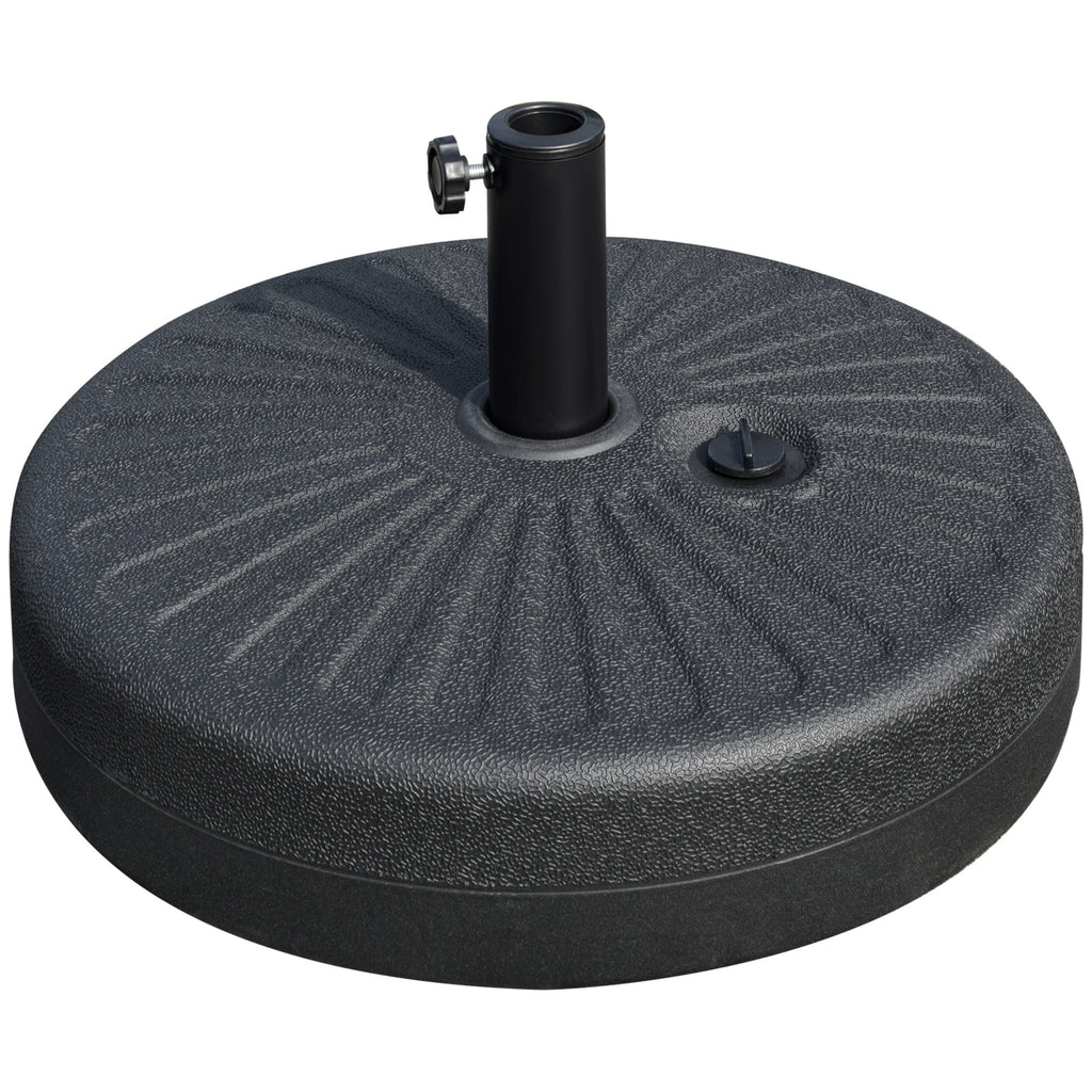 This umbrella stand base provides the perfect foundation for your patio or garden umbrella, ensuring stability and security. Designed for umbrellas with pole diameters of 1.5" (3.8 cm) or 1.9" (4.8 cm), it features a fillable design that can hold up to 48 lbs (22 kg) when filled with water, providing excellent support against wind and outdoor elements. The base includes a built-in handle for easy carrying, with a lightweight 4 lbs (2 kg) body that makes it convenient to move around. The hand-tightening rotary knob makes securing your umbrella simple; just slide in the pole and turn the knob for a secure fit. Made with a durable HDPE plastic bottom to prevent chipping, peeling, or aging, the steel pole with powder coating ensures that the umbrella stands firm and lasts through all outdoor conditions. This stand is ideal for use with the Outsunny umbrella SKU: 84D-157 (contact us for product links). Please be sure to measure your umbrella pole to ensure compatibility.
