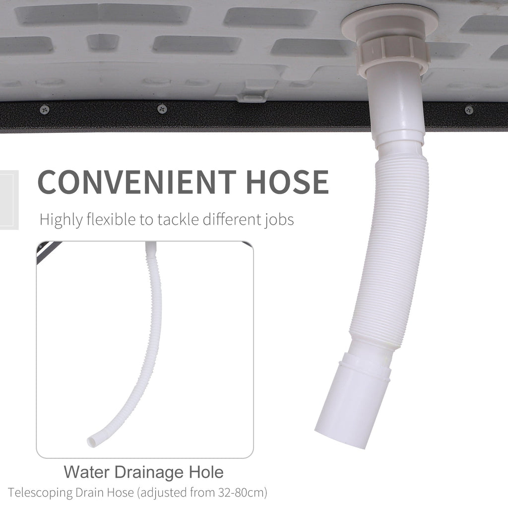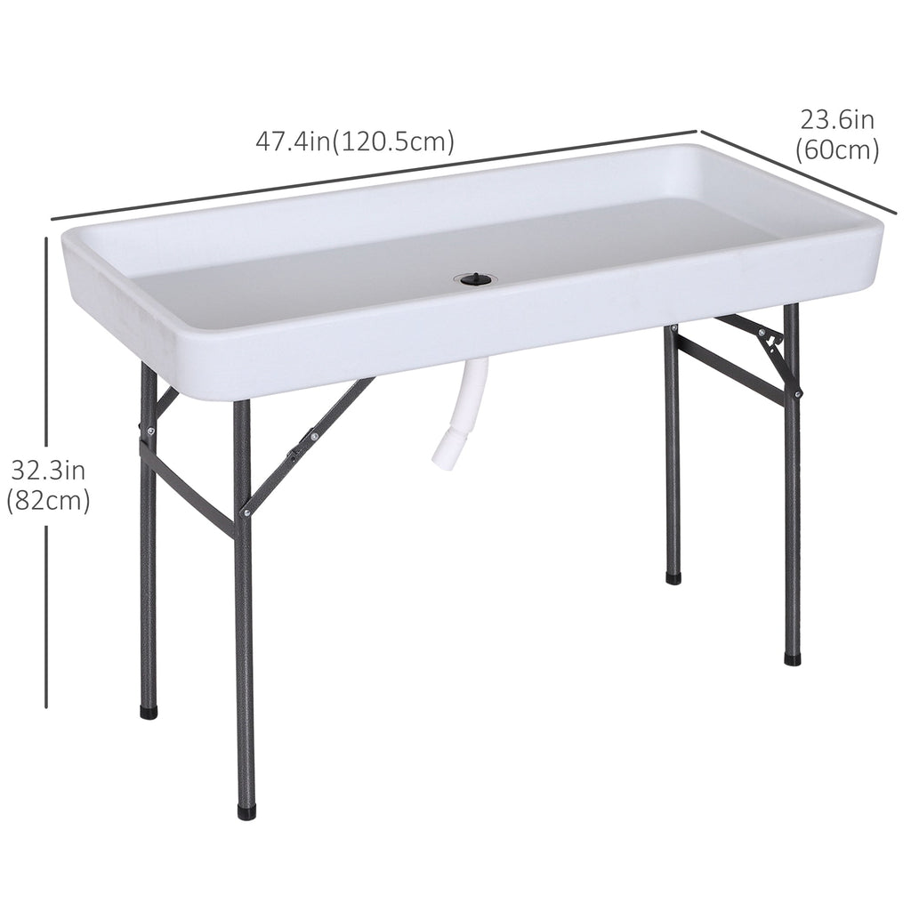 Designed for outdoor convenience, this portable camping table offers a perfect solution for your picnics, camping trips, and other outdoor activities. Crafted with a high-density plastic (HDPE) tabletop and durable steel legs, this table ensures long-term stability and durability, while being eco-friendly, as HDPE is made from recycled materials and can be easily recycled itself. The table includes a telescoping hose for water drainage, adjustable from 12.6" to 31.5", providing flexibility to suit various needs. Its folding design allows the legs to be collapsed for easy storage and transport, and the powder-coated finish on the legs ensures rust resistance for long-lasting use. With a sloped surface and raised edges, the table also makes it easy to maintain a clean working area, making it ideal for any outdoor activity, from parties to fishing trips.