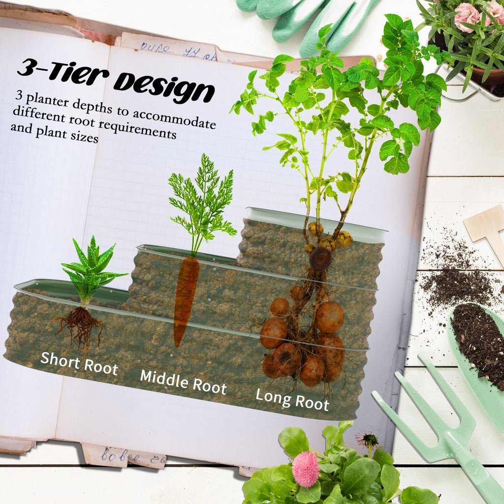 Three-Tier Design: Offers different planting depths to accommodate plants with varying root lengths; can be arranged in a linear configuration to create multiple planting areas.