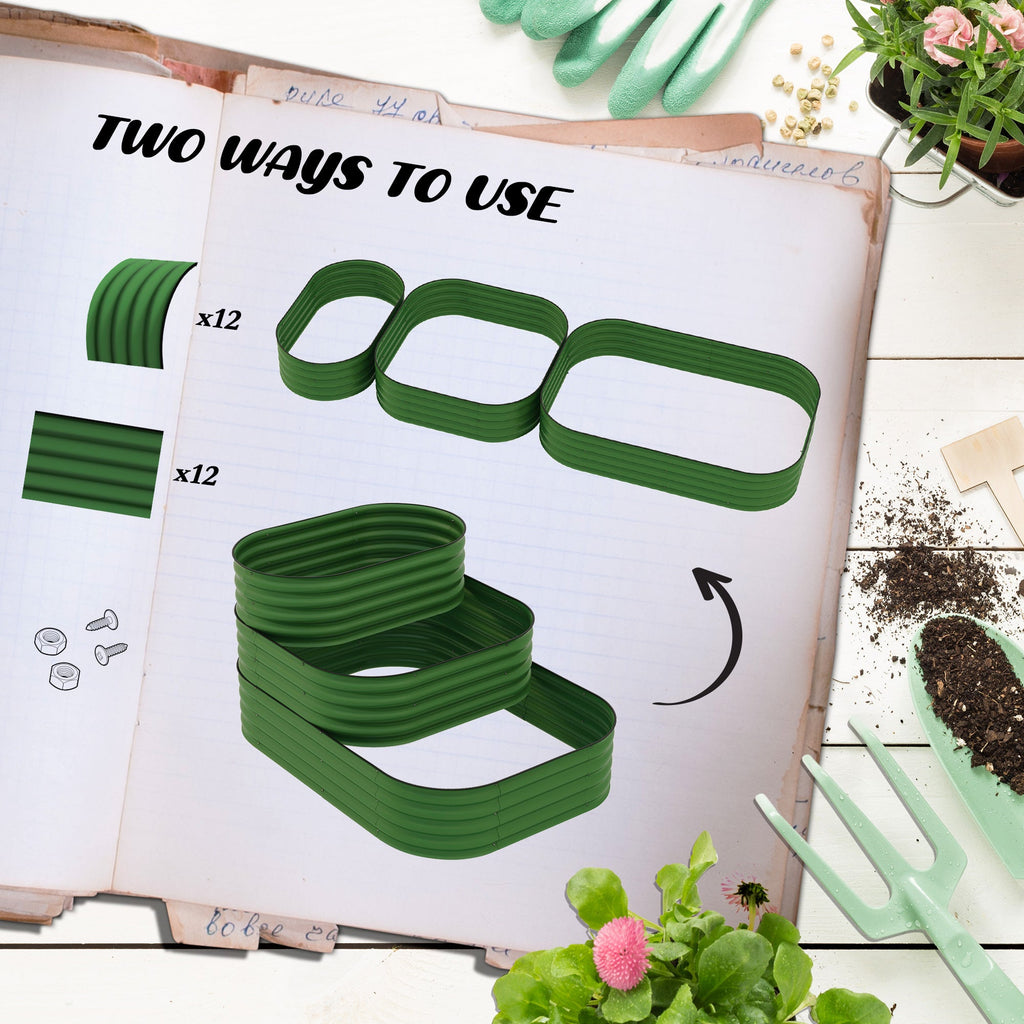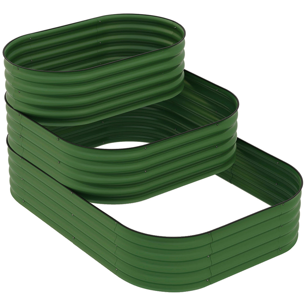 This galvanized raised garden bed features a three-tier design, offering different planting depths to accommodate plants and vegetables with various root lengths. You can also arrange the tiers in a linear configuration, creating three distinct planting areas of different sizes to suit your gardening needs. Constructed from durable 0.6mm thick galvanized steel, the garden bed is designed to withstand prolonged exposure to soil and resist corrosion, ensuring it will last through various weather conditions. The open-bottom design promotes excellent drainage, preventing water accumulation and root decay while allowing roots to absorb nutrients more effectively. For added safety, the top edges of the garden bed are finished with a rubber seal, preventing sharp edges and protecting your hands during assembly and maintenance. With an overall dimension of 62.2" L x 42.9" W x 32.3" H (158 x 109 x 82 cm), this raised bed offers ample space for gardening and is easy to assemble.