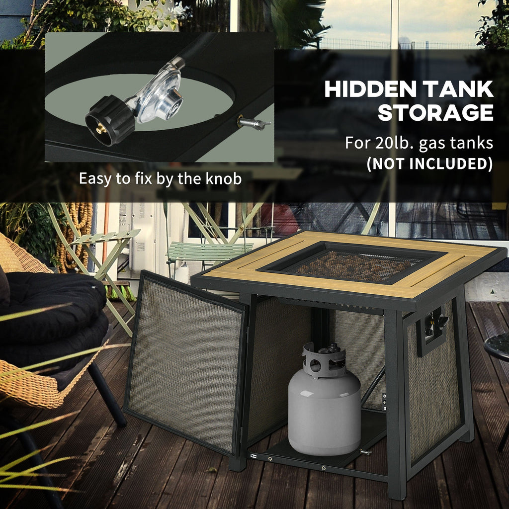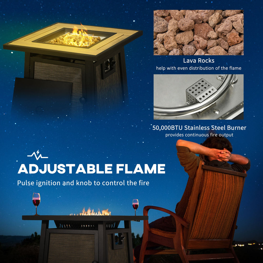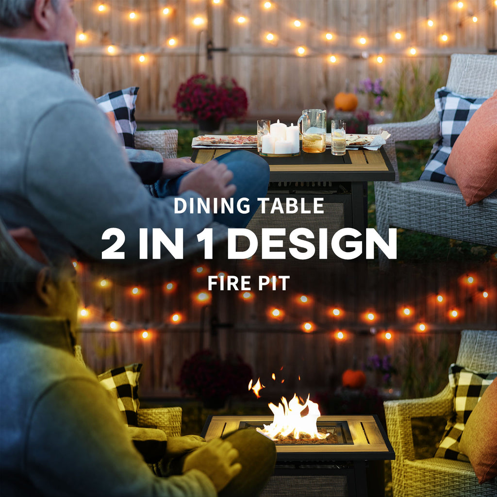 Elevate your outdoor gatherings with this versatile Gas Fire Pit Table that combines functionality and ambiance in one elegant design. Perfect for patios, decks, or backyards, this natural gas fire pit doubles as a dining or coffee table when the lid is placed on top, making it ideal for meals, drinks, or roasting marshmallows with 2 to 4 friends. Its 50,000 BTU stainless steel burner is CSA-certified and delivers a clean, adjustable, smokeless flame that’s easy to ignite with the built-in electric ignition system (batteries required). Lava rocks retain heat and enhance the cozy atmosphere. Designed for convenience and safety, the fire table runs on a standard 20 lb. gas tank, which is neatly secured in a hidden compartment behind a magnetic door. It also includes an automatic shut-off feature to prevent gas buildup if the flame accidentally goes out. When not in use, protect it with the included waterproof 600D Oxford fabric cover with PVC coating. With a sleek square design and durable construction, this fire pit table is the perfect centerpiece for outdoor entertaining all year round.