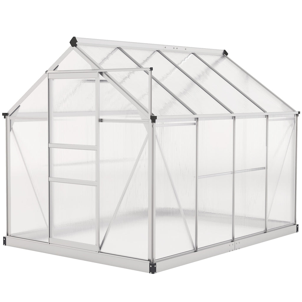 Enjoy year-round gardening with the Outsunny polycarbonate walk-in greenhouse, designed to create a stable and controlled environment for your plants. Whether you're growing vegetables, flowers, or herbs, this greenhouse offers a reliable space to protect and nurture your plants through every season. The high-quality polycarbonate sheets effectively shield plants from harsh weather while allowing ample natural light to penetrate, ensuring optimal growth. Constructed with a heavy-duty powder-coated aluminum alloy frame and a galvanized sheet base, this greenhouse is built for durability and stability. The convenient sliding door allows for easy access while maintaining the structure’s integrity. For improved airflow and temperature regulation, the rooftop vent panel provides necessary ventilation to support healthy plant growth. With a spacious walk-in design, this greenhouse is perfect for gardening enthusiasts looking to extend their growing season. Please note that while this greenhouse offers excellent protection, it is not designed to withstand extreme weather conditions such as heavy snow.