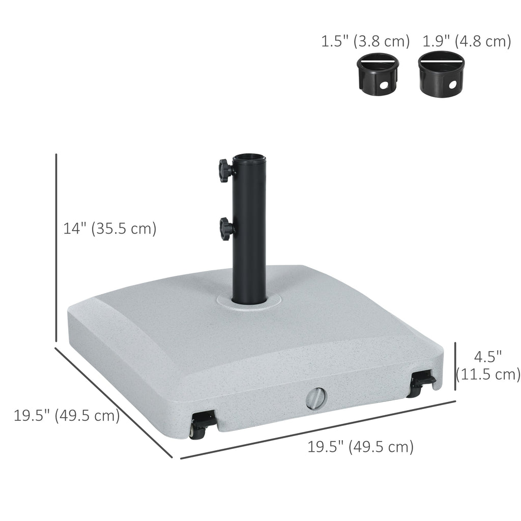 Ensure your outdoor umbrella stays securely in place with this heavy-duty and versatile umbrella base stand. Designed to accommodate parasol poles with diameters of 1.5" (3.8 cm) or 1.9" (4.8 cm), this stand includes two adjustable knobs to keep the pole firmly secured, even on breezy days. Its fillable design offers exceptional stability, weighing up to 53 lbs (24 kg) with water or 66 lbs (30 kg) with sand. For optimal balance and weight, you can fill it with dry sand and top it off with water using the conveniently located side fill port, which also makes emptying and cleaning hassle-free. Featuring four integrated wheels—two of which have brakes—this umbrella base provides easy mobility so you can reposition your market umbrella anywhere in your outdoor space and lock it securely in place. Built with a robust PE plastic base and a powder-coated metal pole, it is resistant to various weather conditions, making it a dependable companion for your patio, garden, or deck. Measuring 19.5" L x 19.5" W x 14" H (49.5 x 49.5 x 35.5 cm), it offers functionality, convenience, and long-lasting performance. Assembly is quick and straightforward.