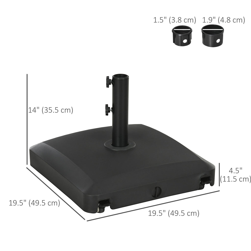 Keep your outdoor umbrella steady and secure with this durable and versatile rolling umbrella base stand. Designed to fit parasol poles with diameters of 1.5" (3.8 cm) or 1.9" (4.8 cm), it features two adjustable knobs that ensure your umbrella stays firmly in place even on breezy days. The fillable design allows for up to 53 lbs (24 kg) of weight when filled with water or 66 lbs (30 kg) with sand—ideal for stability and wind resistance. You can also use a combination of dry sand and water, thanks to the easy-access fill port located on the side, which makes both filling and cleaning a breeze. With four integrated wheels and two locking brakes, this base allows for effortless movement across your patio, garden, or deck, and stays securely positioned once in place. Built with a sturdy PE plastic base and a powder-coated metal pole, it’s crafted to endure the elements and provide long-term support. Measuring 19.5" L x 19.5" W x 14" H (49.5 x 49.5 x 35.5 cm), this umbrella base is the perfect combination of strength, stability, and convenience. Assembly required.