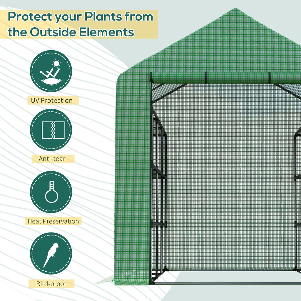 Ensure your plants thrive all year round with this sturdy garden greenhouse. Designed to protect your plants, fruits, vegetables, and flowers from the elements, this greenhouse offers a controlled environment that promotes healthy growth. The durable PE cover allows excellent light transmission, ensuring your plants receive the sunlight they need while trapping heat for warmth even during the coldest days. Featuring a large side door that opens fully and can be rolled up with ties, this greenhouse provides easy access and enhances ventilation for your plants. Built with a strong, powder-coated steel frame and horizontal supporting tubes, the structure ensures long-lasting stability. The airtight and secure design is further reinforced by burying the 3.9" edging in the soil, creating a tight seal to keep the elements out. For added stability, the greenhouse includes four guy ropes that can be pulled tightly to the ground stakes. Whether you’re growing flowers, vegetables, or tropical plants, this hothouse greenhouse offers the perfect solution for protecting and nurturing your plants.