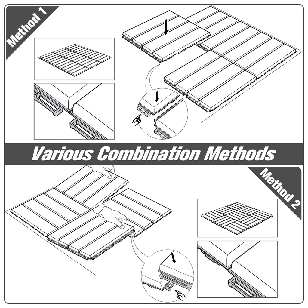 Transform your outdoor or indoor space with ease using these DIY-friendly interlocking deck tiles. Designed for ultimate convenience, the snap-lock connectors eliminate the need for glue, screws, or complicated tools—simply click the tiles together to create the layout that fits your vision. Made from durable polypropylene, each tile features a stylish wood-textured finish that resists fading, slipping, and wear, offering a long-lasting and low-maintenance flooring solution. These versatile tiles are perfect for terraces, balconies, walkways, bathrooms, or saunas, providing a safe, slip-resistant walking surface with efficient water drainage. Each tile measures 11.8" x 11.8", and a set of 9 covers approximately 9 square feet, making them ideal for customizing any flat ground surface. Whether you're looking to upgrade your outdoor patio or add function and flair to an indoor space, these interlocking tiles offer a hassle-free, stylish, and practical flooring solution. Note: Not recommended for pet use due to potential claw wear.