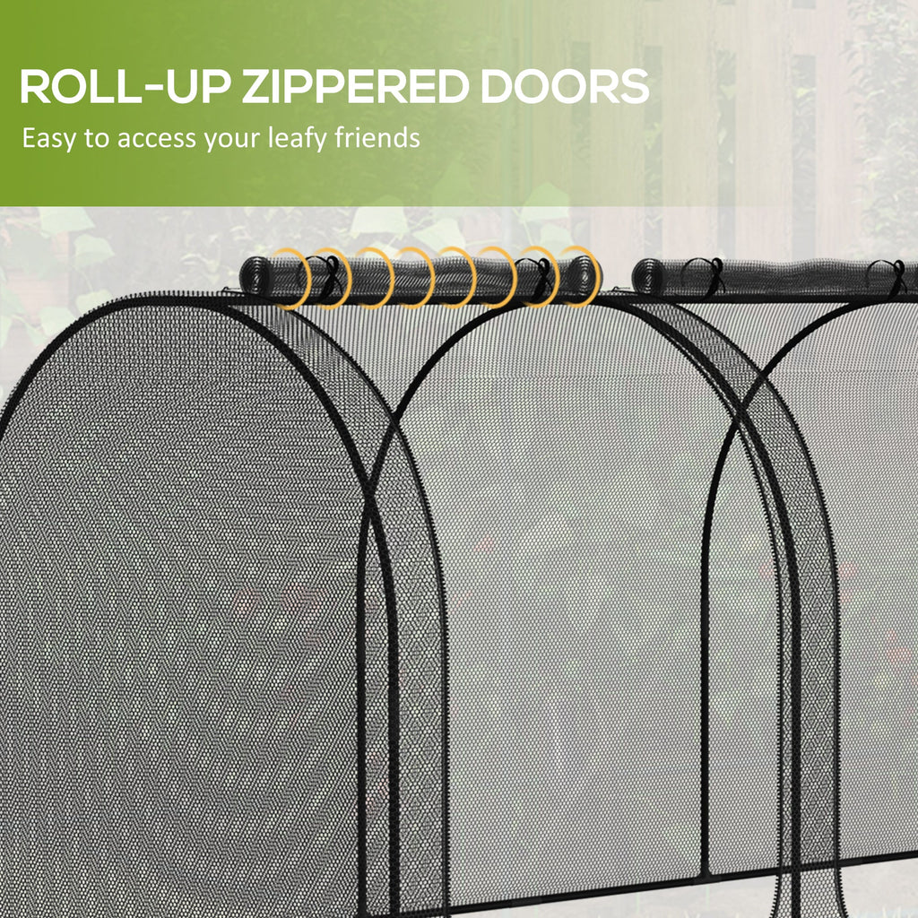 Protect your garden plants and crops with this HDPE plant protector, designed to shield them from harsh sunlight, birds, and small animals. The mesh design ensures your plants receive nourishment from the sun and rain while providing reliable protection. Easy to assemble and disassemble, this garden protection cage is lightweight and portable, allowing you to move it with ease throughout the seasons. It features three zippered doors, offering easy access to your plants for maintenance and harvesting. To enhance stability and reduce wind disruption, ground stakes help secure the structure firmly in place, while burying the frame deep in the soil provides additional support. With overall dimensions of 106.3" W x 47.2" D x 47.2" H (270 x 120 x 120 cm), it offers ample space for your crops. The door size is 25.2" W x 57.1" H (64 x 145 cm), making it convenient for quick access. Ideal for 1-2 people to assemble, this plant protector ensures your garden stays safe and thriving.