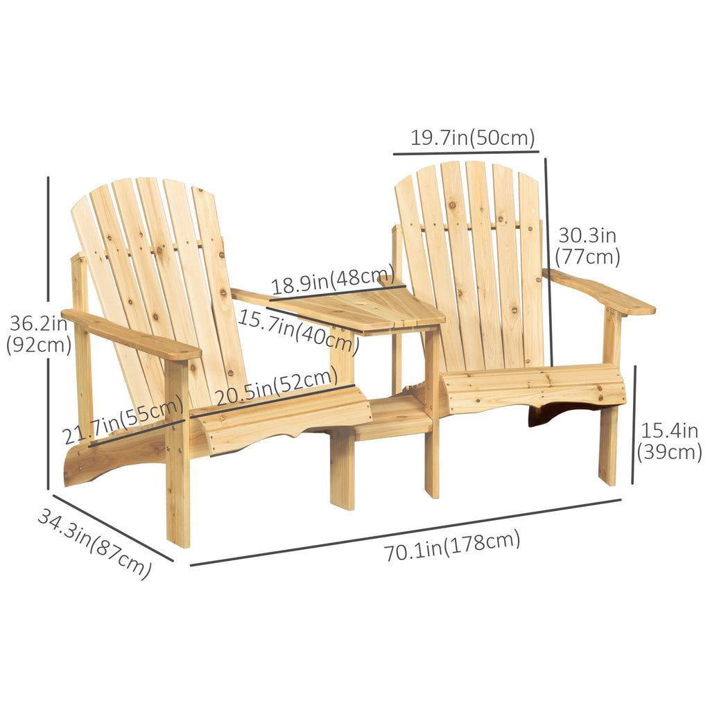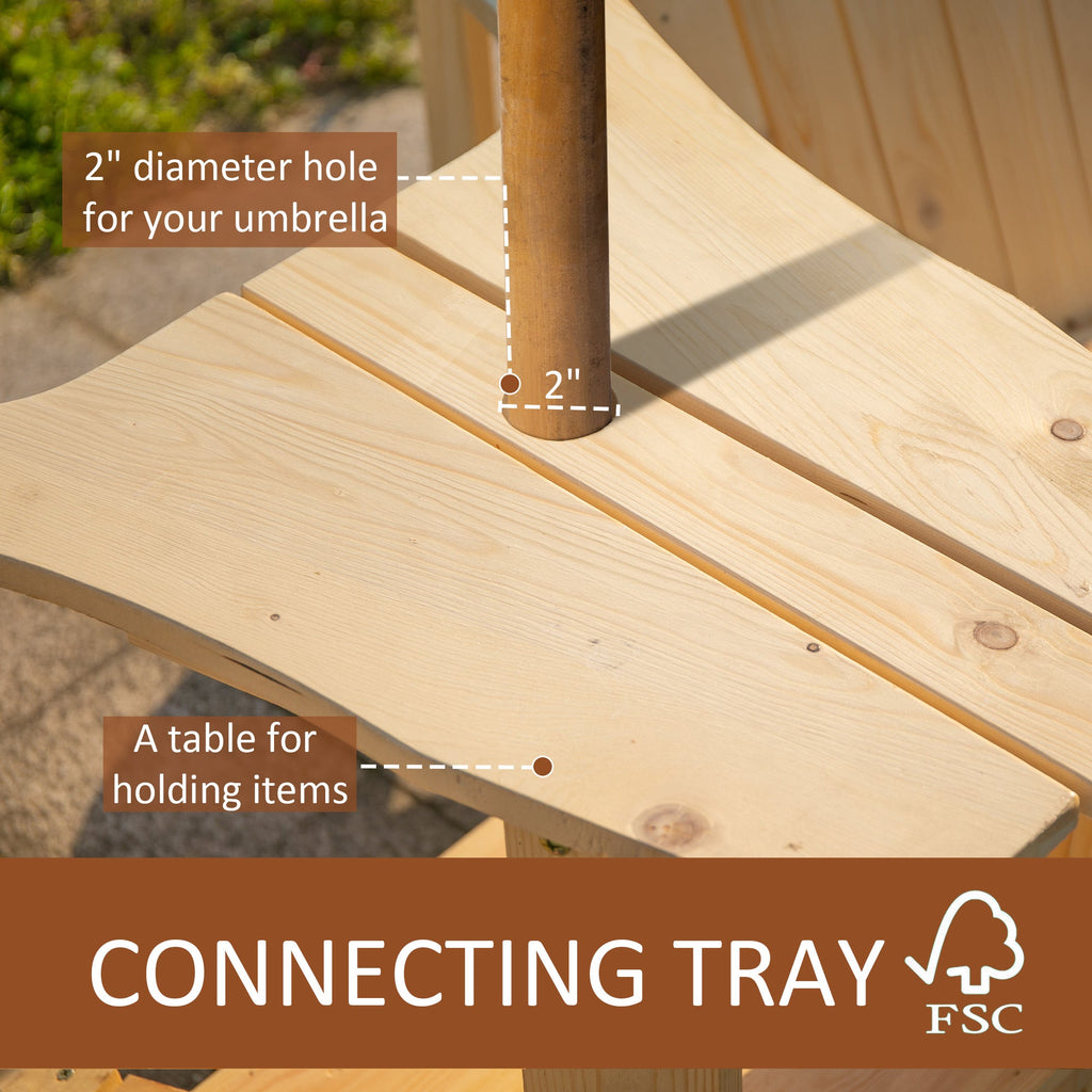 Elevate your outdoor seating with this Ergonomically Designed Muskoka Chair, a perfect blend of comfort, style, and durability. Featuring two seats with wide armrests, a rolled top seat, a slightly curved seat back, and a tilted high back rest, this chair is crafted for optimal relaxation. Designed to fit seamlessly into any outdoor setting, it adds charm to your patio, garden, porch, or poolside. The chair also includes an umbrella hole in the center of the table, making it easy to add a shade for protection against the sun or rain. (Inner diameter: 2"). Constructed from natural fir wood with weather-resistant paint, this chair ensures long-lasting durability while bringing a timeless, rustic aesthetic to your outdoor space. Whether by the fire pit or in your backyard, this chair provides both functional comfort and aesthetic appeal.