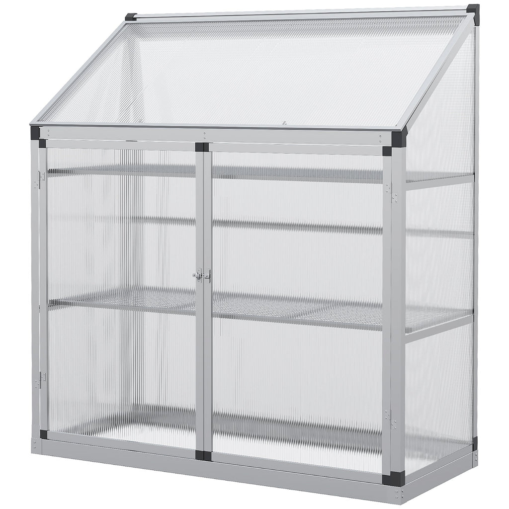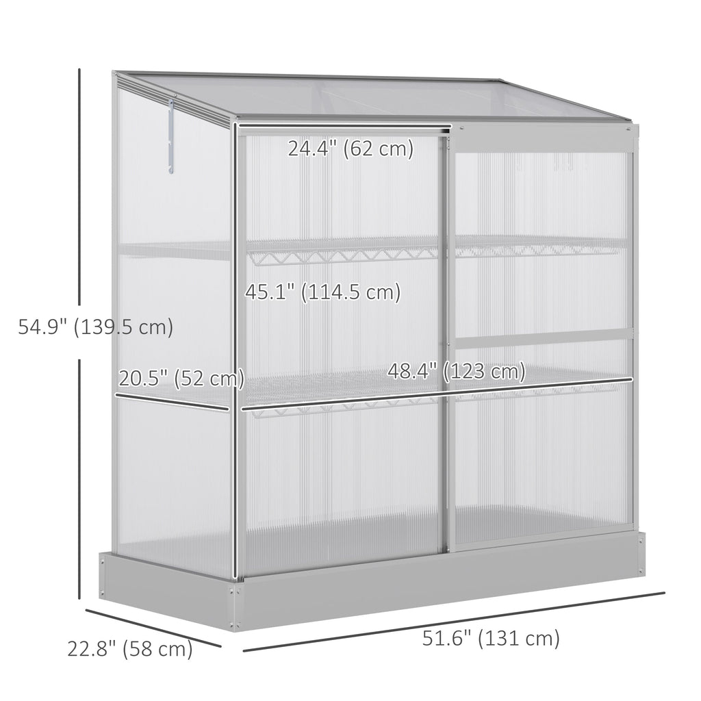 Create the perfect environment for your plants with this outdoor greenhouse, designed to offer durability and functionality. Featuring a strong aluminum frame and a galvanized steel base, this greenhouse ensures stability when securely anchored to the ground. The included polycarbonate panels allow over 90% sunlight penetration while protecting your plants from harmful UV rays, water, and wind. Designed with 2 shelves, this greenhouse offers ample room to organize and grow your plants, vegetables, and flowers. The metal bar can prop open the roof, enhancing air circulation to promote healthy plant growth in the cooler months. Perfect for anyone looking to extend their growing season.