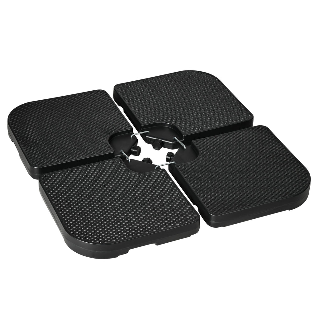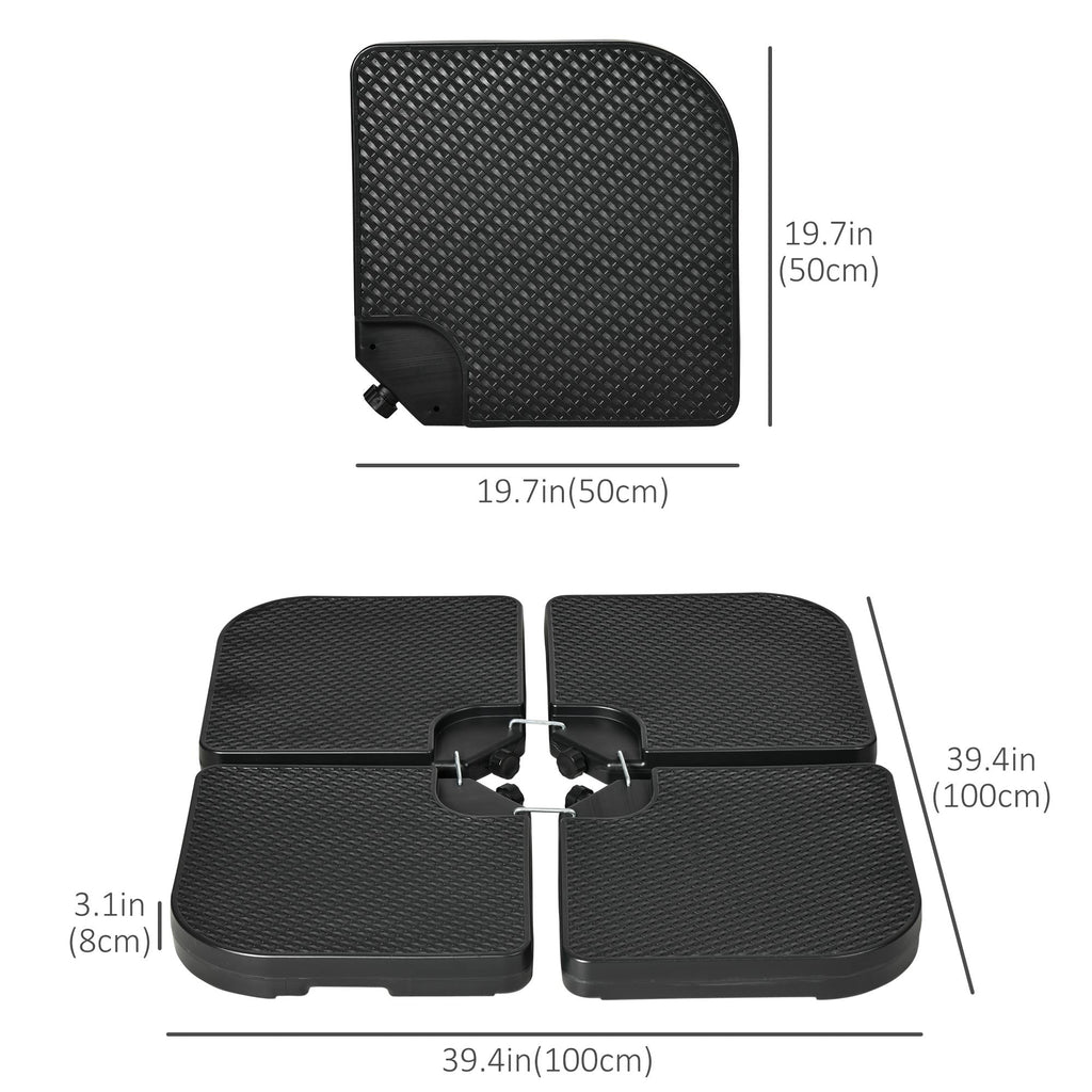 Keep your cantilever banana parasol secure and stable with these Four-Piece Weights, designed specifically to support your garden umbrella and provide reliable shade. The weights are ideal for use with offset umbrellas and can be filled with either water or sand. When filled with water, the total weight is 130lbs (60kg), and when filled with sand, the total weight increases to 175lbs (80kg). The unique design allows you to fill each weight plate with dry sand and then add water to further enhance stability. The built-in filling ports make the process quick and easy, and the integrated handles ensure effortless transport. When not in use, the plates can be stacked compactly for storage or transport. Constructed from high-quality, all-weather HDPE material, these weights are designed to withstand the elements, ensuring long-term durability. Please note that the cross base is not included, but these weights are perfect for maintaining the stability of your parasol throughout the outdoor season.