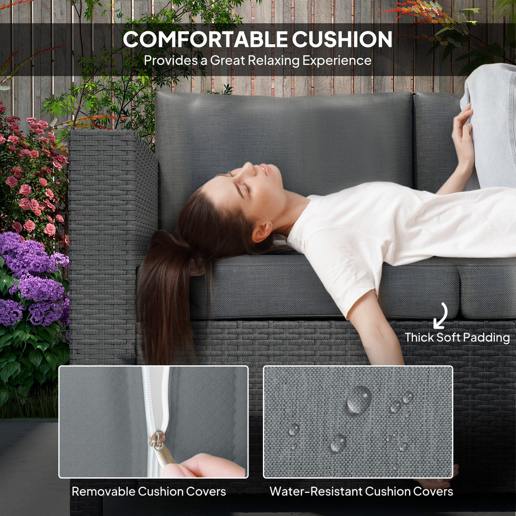 Elevate your outdoor living area with the Outsunny 3-Seater Rattan Sofa, designed to comfortably accommodate up to three people. Perfect for patios, porches, backyards, balconies, poolside areas, gardens, and more, this sofa offers a stylish and functional seating solution for any outdoor space. Built with a strong and solid steel frame, it features high-quality powder-coated steel and is wrapped in weather-resistant, hand-woven rattan wicker for enhanced durability. The sofa’s plush, thick cushions and curved armrests provide an exceptional level of comfort, while the removable, washable cushion covers make cleaning a breeze. Whether you're entertaining guests or simply relaxing, this 3-seater rattan sofa brings both style and comfort to your outdoor sanctuary.