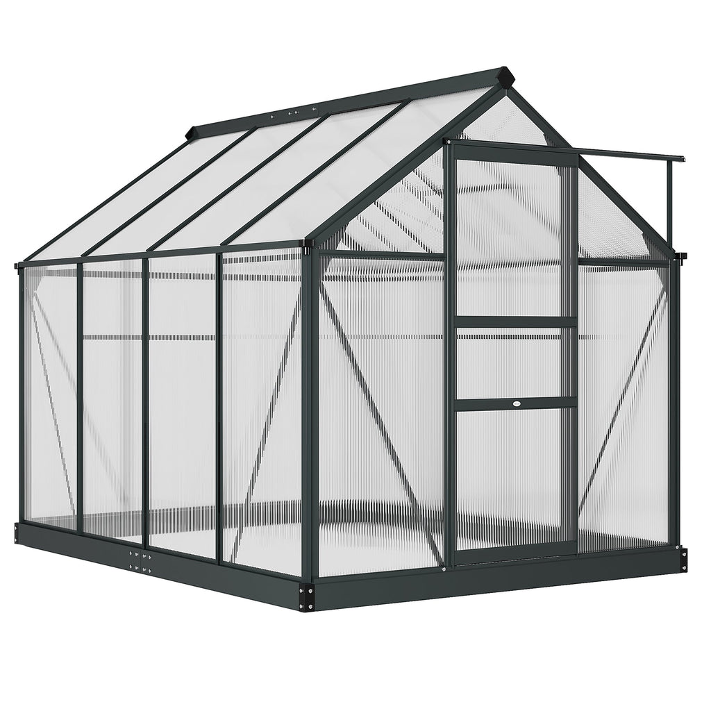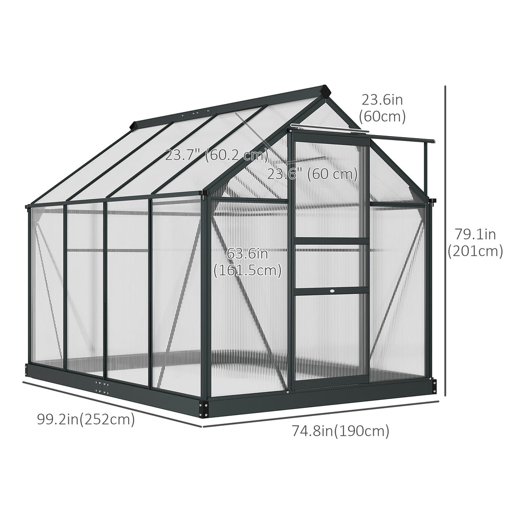 The Outsunny polycarbonate walk-in greenhouse is the perfect year-round solution for your gardening needs. Designed to protect your plants, vegetables, and flowers, this greenhouse offers a stable environment throughout all seasons. Its polycarbonate sheets allow natural light to filter through while safeguarding your plants from inclement weather. The heavy-duty aluminum alloy frame ensures structural integrity, while the galvanized sheet provides additional support for the exterior. The sliding door design allows for easy access, and a hinged rooftop vent panel ensures proper airflow, keeping your plants healthy. Please note that this greenhouse is not designed to withstand extreme weather conditions like heavy snow.