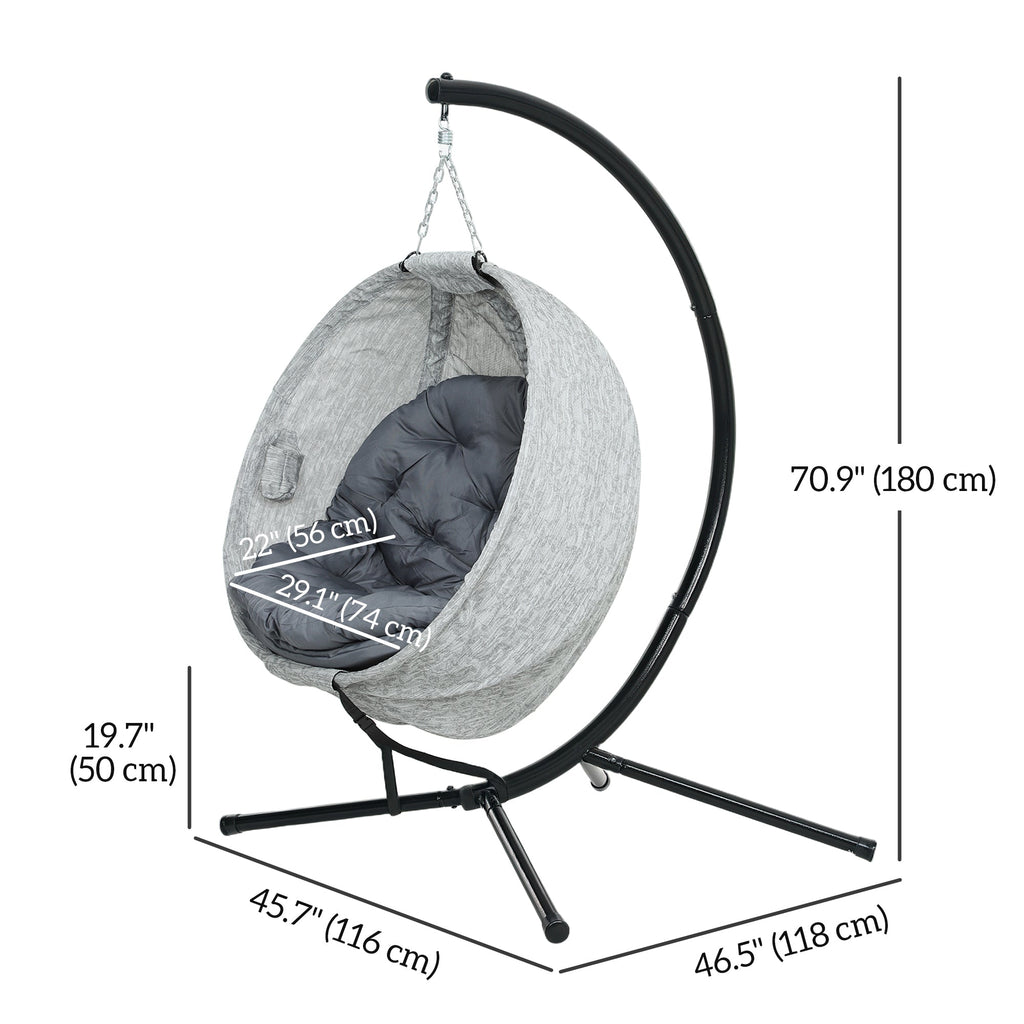 The Outsunny Spacious Egg Swing Chair offers a relaxing and stylish place to unwind. Its wide seat is covered in 560gsm leaves-pattern mesh fabric, ensuring breathability and comfort, like a cool, airy bird nest. With a thickened 5.1" (13 cm) cushion and a bottom cushion for extra support, this swing chair provides cloud-like comfort perfect for reading, enjoying a drink, or watching the sunset. The folding basket design allows easy storage when not in use, and the built-in side cup holder keeps your drinks secure. The robust powder-coated steel frame, combined with an X-shaped base and foot pads, supports up to 265 lbs (120 kg), making it both durable and reliable. Adjustable chains let you customize the swing's height for the ultimate relaxing experience.