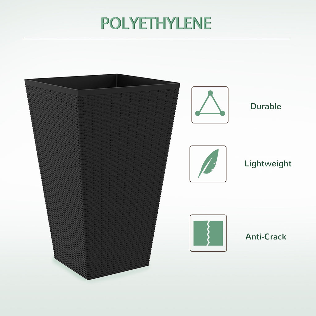 Add a touch of elegance to your outdoor or indoor space with this Planter Set of 3. Featuring a stylish rattan-like surface design, these tall planters are perfect for brightening up your garden, patio, or home. Made from UV-stabilized PP plastic, they offer durability and resistance against cracking and fading, ensuring long-lasting use. Each planter is equipped with a self-draining hole at the bottom to prevent water accumulation, ensuring healthy growth for your plants. Simply add the included plug when using indoors to avoid water leakage. These lightweight planters are perfect for both indoor and outdoor use, providing a versatile and functional addition to any space.