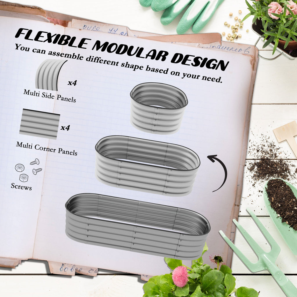 Create a customized garden setup with this versatile Raised Garden Bed, designed for durability, safety, and flexibility. Built from 0.6mm thick galvanized steel, this outdoor planter resists warping, rust, and deformation, delivering reliable performance season after season. Fastening screws at the joints enhance structural stability, ensuring long-term use without loosening. A protective rubber strip lines the top edge for safe handling, minimizing the risk of cuts or scrapes. Its open-bottom design encourages proper drainage and promotes deeper root growth, helping your plants access nutrients more efficiently. Featuring a modular panel design, this garden bed can be assembled in different shapes to suit your space and planting preferences. Quick to install and perfect for patios, backyards, or gardens, it's a smart solution for growing vegetables, herbs, or flowers.