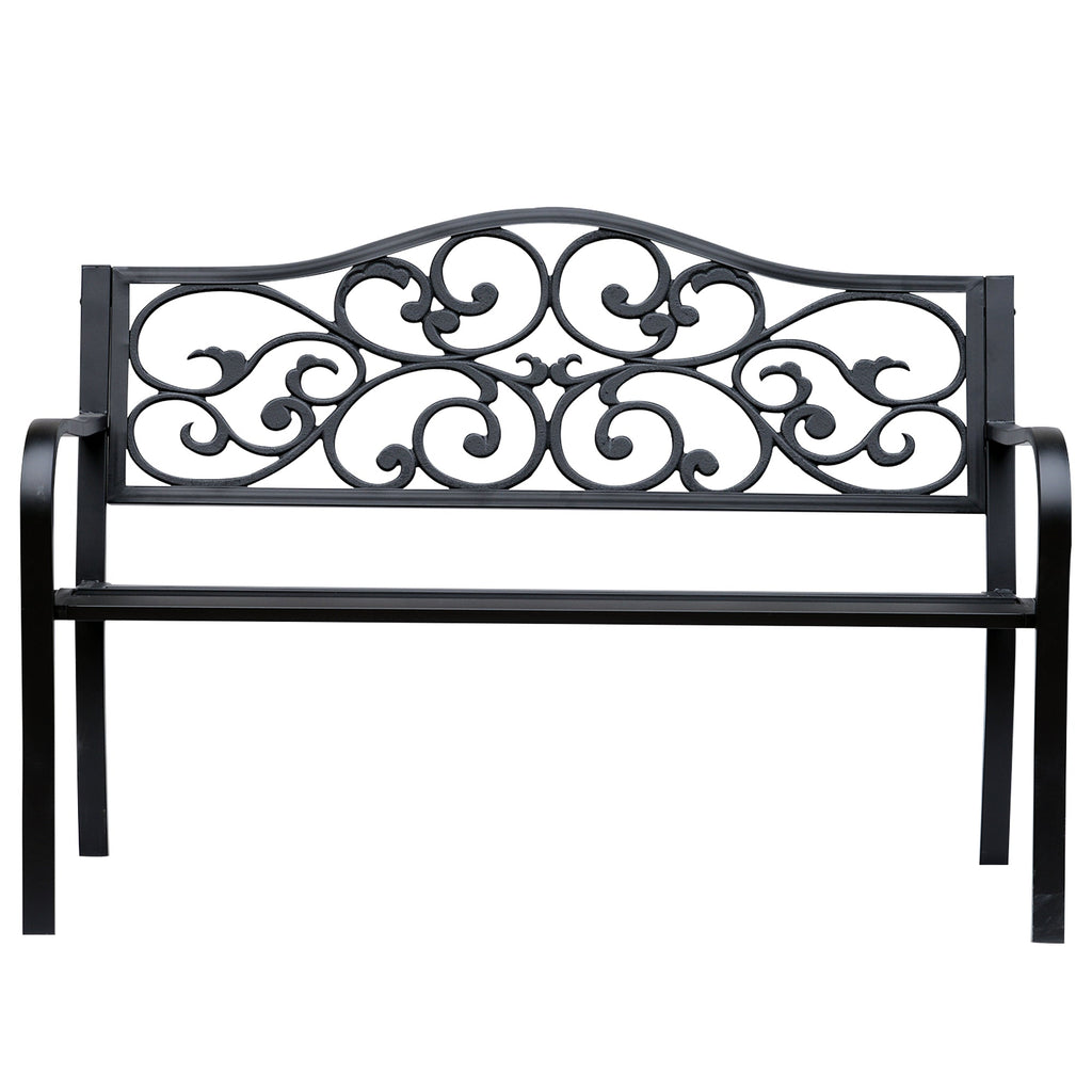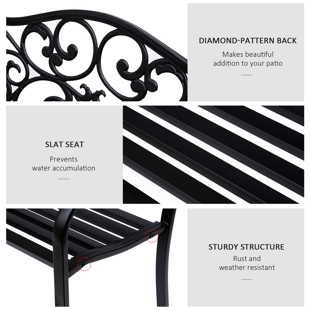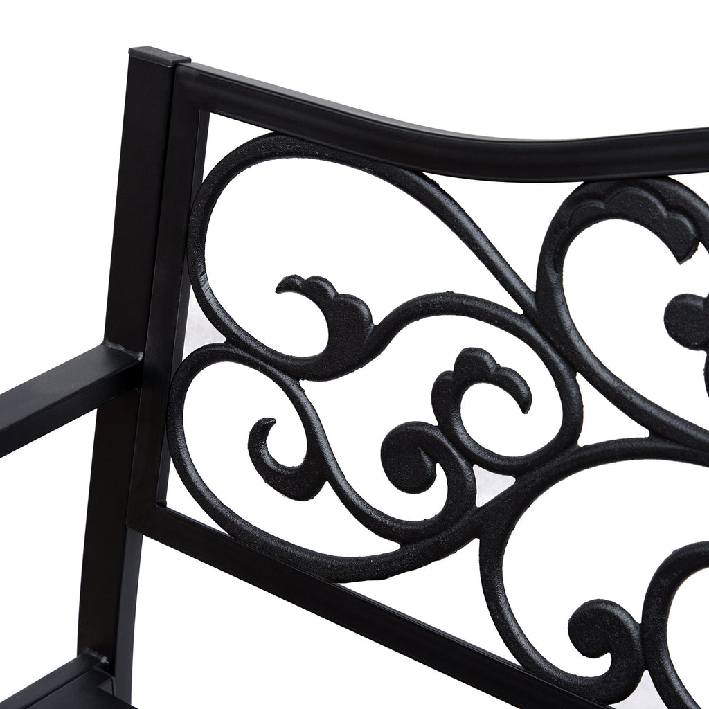 Enhance your outdoor space with this Sturdy Metal Frame Garden Bench. Featuring a durable powder-coated steel frame with a cast metal backrest, this bench offers both comfort and sturdiness for long-lasting outdoor use. The weatherproof and rustproof material ensures it can withstand the elements, allowing it to stay outdoors for extended periods without worry. Designed for two-person seating, the bench comfortably supports up to 528 lbs (240 kg), making it perfect for relaxing with a friend. The distinctive vintage floral backrest pattern adds a touch of elegance, transforming your garden or patio into a charming retreat. The slatted seat design ensures quick drainage, making maintenance a breeze. Whether placed in your front yard, backyard, or patio, this antique-style loveseat is sure to elevate the aesthetic of any outdoor area.