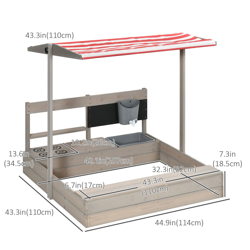 Create a fun and interactive outdoor play space with this kids' sandbox, complete with a kitchen playset and adjustable canopy. Designed to provide hours of entertainment, the sandbox features a water-resistant canopy that offers shade on sunny days and protection from rain. The canopy's height and angle are adjustable to suit your needs, and when not in use, it can be lowered over the sandbox for added protection. The built-in kitchen playset includes a faucet, sink, stove top, and stainless steel pots, pans, and utensils, offering kids a playful, immersive experience. A convenient storage shelf is included for keeping items organized. Made from durable fir wood, this sandbox is built to withstand outdoor use while providing a clean, bottomless play area with a liner to keep the sand contained.