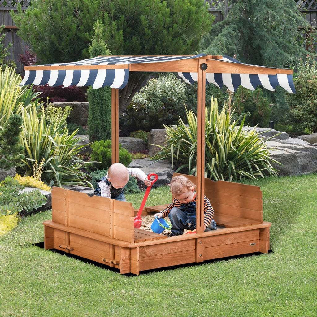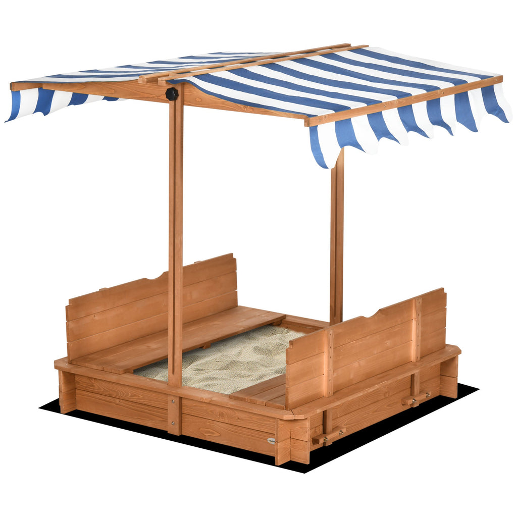 Transform your backyard into a fun-filled play zone with this versatile wooden sandbox designed for kids! Featuring an adjustable canopy, you can easily adjust the height to provide the perfect shade, protecting your child from the sun or rain. When not in use, the canopy can be lowered to function as a lid, protecting the sand from the elements, animals, and debris. This sandbox also comes with two comfortable benches with backrests, providing a cozy spot for kids to sit and play above the sand. Both benches and backrests are removable, allowing for flexible play space. Beneath the sandbox, a non-woven fabric liner promotes ventilation and drainage while keeping the sand neatly contained. Perfect for children to engage in creative play, this sandbox encourages imagination and social interaction, offering a large space for friends to join in. This sandbox is ideal for kids aged 3-7 and is a wonderful addition to any outdoor space.