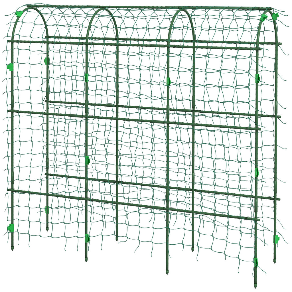 Maximize your garden space and increase your harvest with this versatile garden trellis, perfect for supporting a wide variety of fruits and vegetables such as grapes, cucumbers, peas, zucchini, and other climbing plants. The arch design not only saves valuable garden space but also promotes healthy growth by providing optimal support for your plants. This trellis is easy to assemble, with metal cross clips and plastic clasps that allow for simple connection of the arch tubes. The sharp bottom legs make it easy to insert into the ground, and the adjustable design allows you to customize the trellis to fit the specific growth needs of your plants. The height of each layer can be adjusted to a recommended height of 20.5" (52 cm) to ensure your plants grow comfortably. Constructed with durable steel pipe covered by plastic, this trellis is built to withstand outdoor conditions and ensure long-lasting use. The net is resistant to abrasion, providing excellent support for your climbing plants. With overall dimensions of 16.9" W x 71.7" D x 72" H, this trellis is the perfect addition to any garden to boost productivity and maintain a tidy, organized growing area.