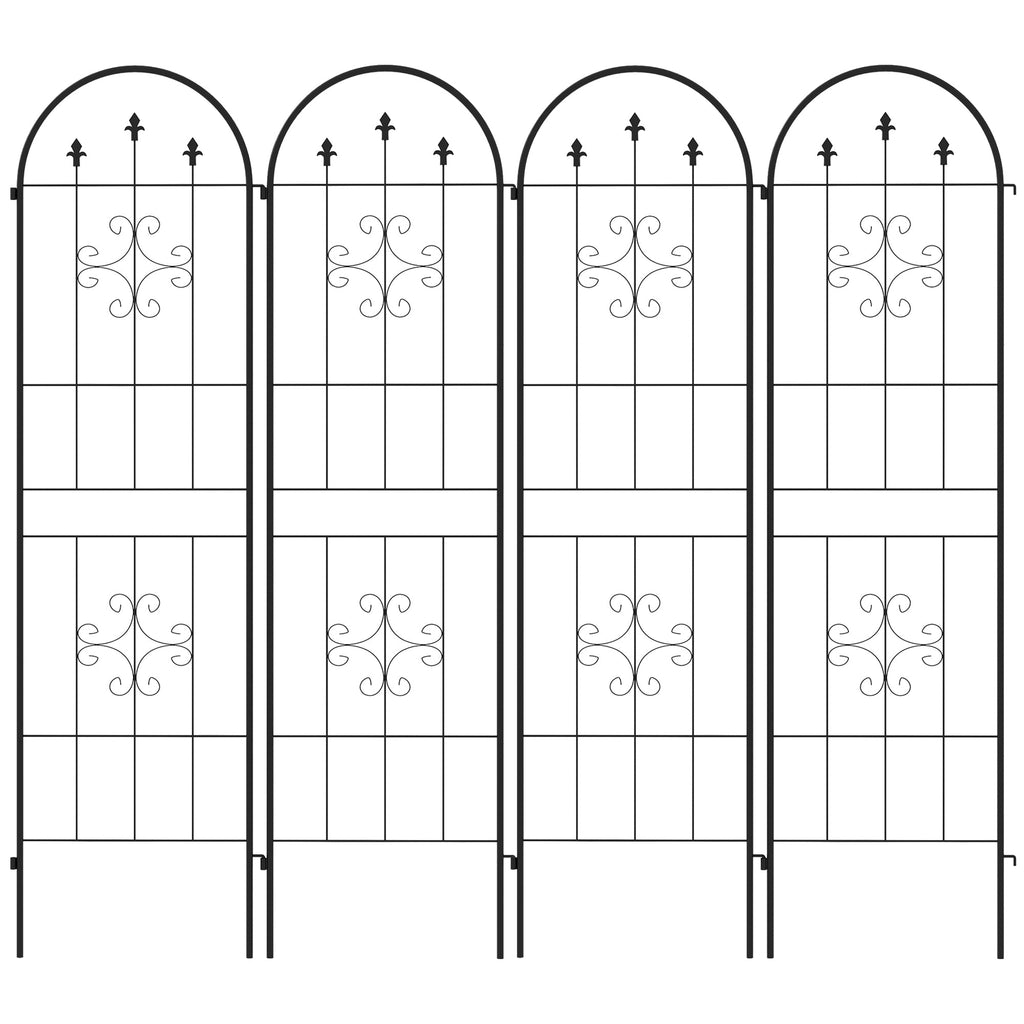 Enhance your garden’s beauty and functionality with this pack of 4 metal trellises. These plant supports are designed to maximize growth and provide optimal space for your plants and vines, keeping them organized and untangled from the rest of your garden. Featuring ground inserts that allow for deep insertion into the soil, these trellises offer stability, are windproof, and can bear the weight of heavier plants. Whether you're creating a statement fence, adding elegance to your garden, or seeking privacy in your outdoor space, these versatile trellis panels are an ideal choice. The durable metal construction is treated with a powder coating to resist rust, ensuring these panels are suitable for long-term outdoor use. Each trellis measures 19.7" W x 70.9" H, with ground inserts that extend 8.7" (22 cm) into the soil.