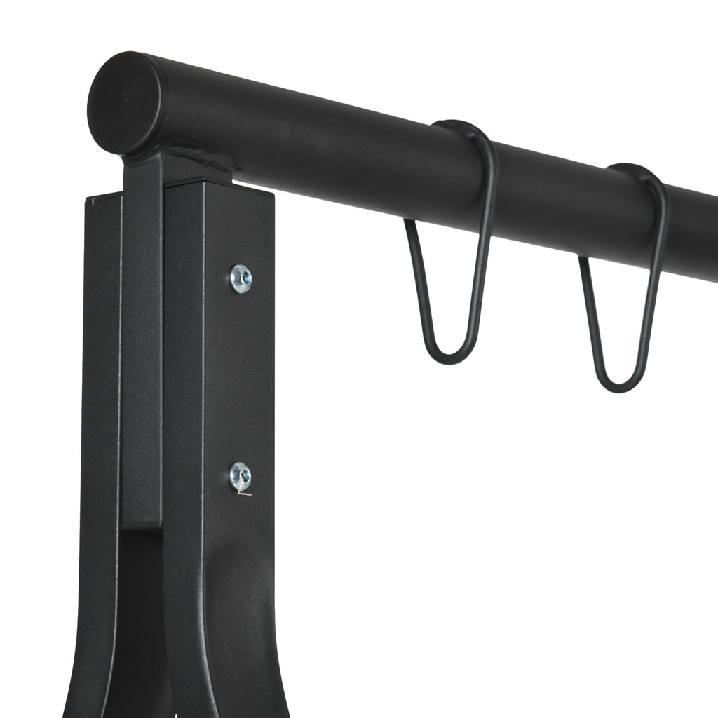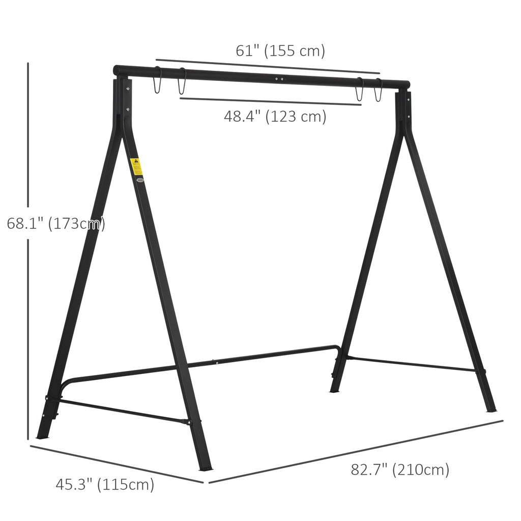 Enhance your outdoor space with this versatile steel swing frame, designed to offer a customizable and durable solution for your patio or porch swing needs. Made from outdoor-ready, powder-coated steel, this swing frame can withstand the elements while supporting up to 528 lbs (240 kg), which is equivalent to the weight of about three adults. The A-frame design provides excellent stability, preventing tipping and ensuring safety. This swing stand comes with four hanging rings, allowing you to customize your swing setup by adding a two-seater or three-seater swing bench. Perfect for various types of hanging chairs, including macrame chairs, net swings, web swings, and saucers. Choose the swing that suits your style, and create the perfect relaxing retreat.