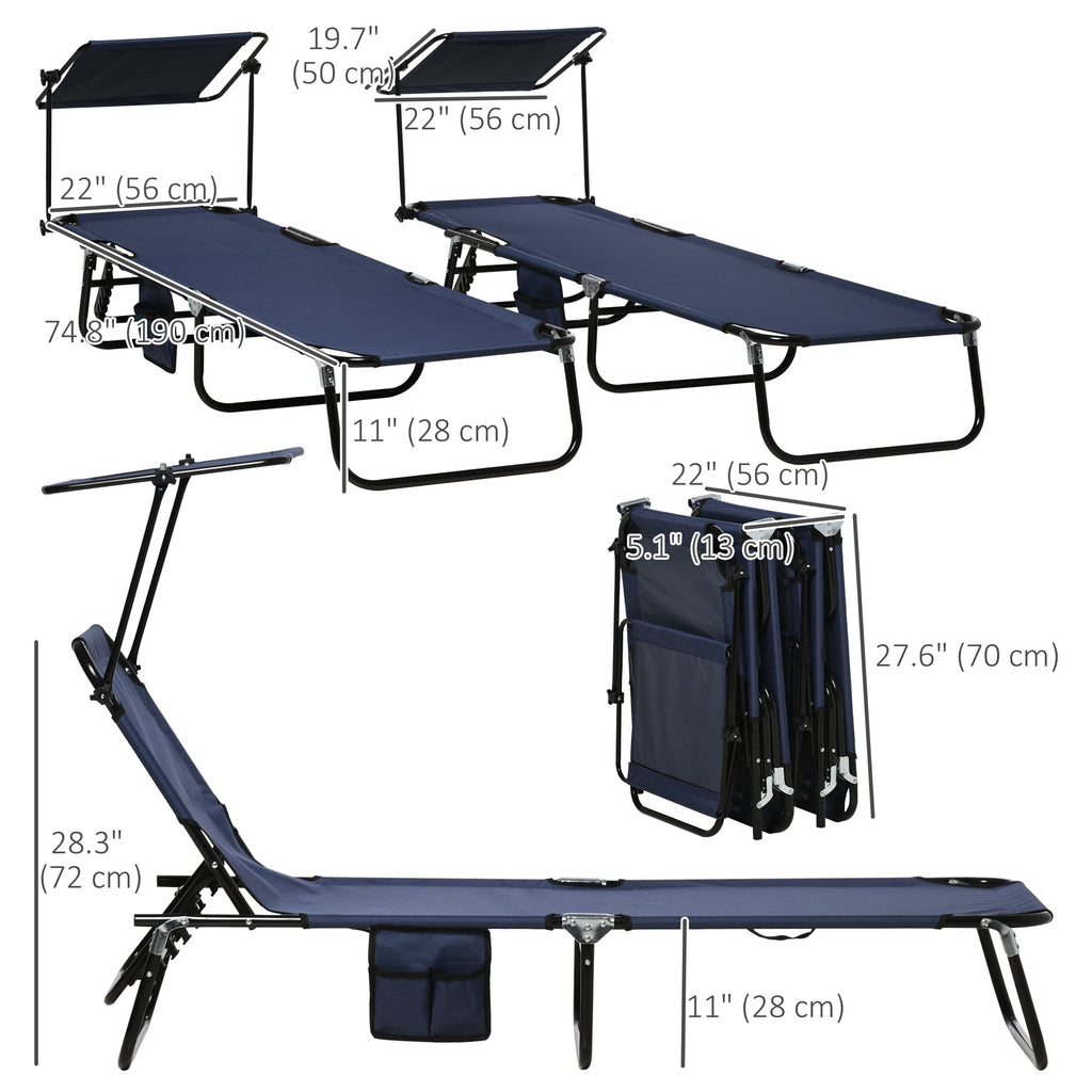 Soak up the sun in comfort and style with this Outdoor Lounge Chairs Set of 2, thoughtfully designed for ultimate relaxation with a friend. Each sun lounger features a built-in sunshade roof, shielding your eyes from harsh sunlight while letting you enjoy the great outdoors without discomfort. Whether you're lounging by the pool, sunbathing at the beach, or relaxing on your backyard lawn, these chairs provide a perfect, breezy retreat. The 5-position adjustable backrests allow you to tailor your lounging angle—from a supportive 100° to a fully flat 180°—making them ideal for reading, tanning, or napping. The breathable Oxford fabric surface keeps you cool on warm days, while the foldable, lightweight design makes transport and storage a breeze. Simply fold and toss them in your trunk for quick getaways or outdoor adventures. With fully reclined dimensions of 22" W x 74.8" D x 11" H and a weight capacity of 264 lbs. each, these chairs combine durability, convenience, and comfort—perfect for any summer outing or backyard setup.