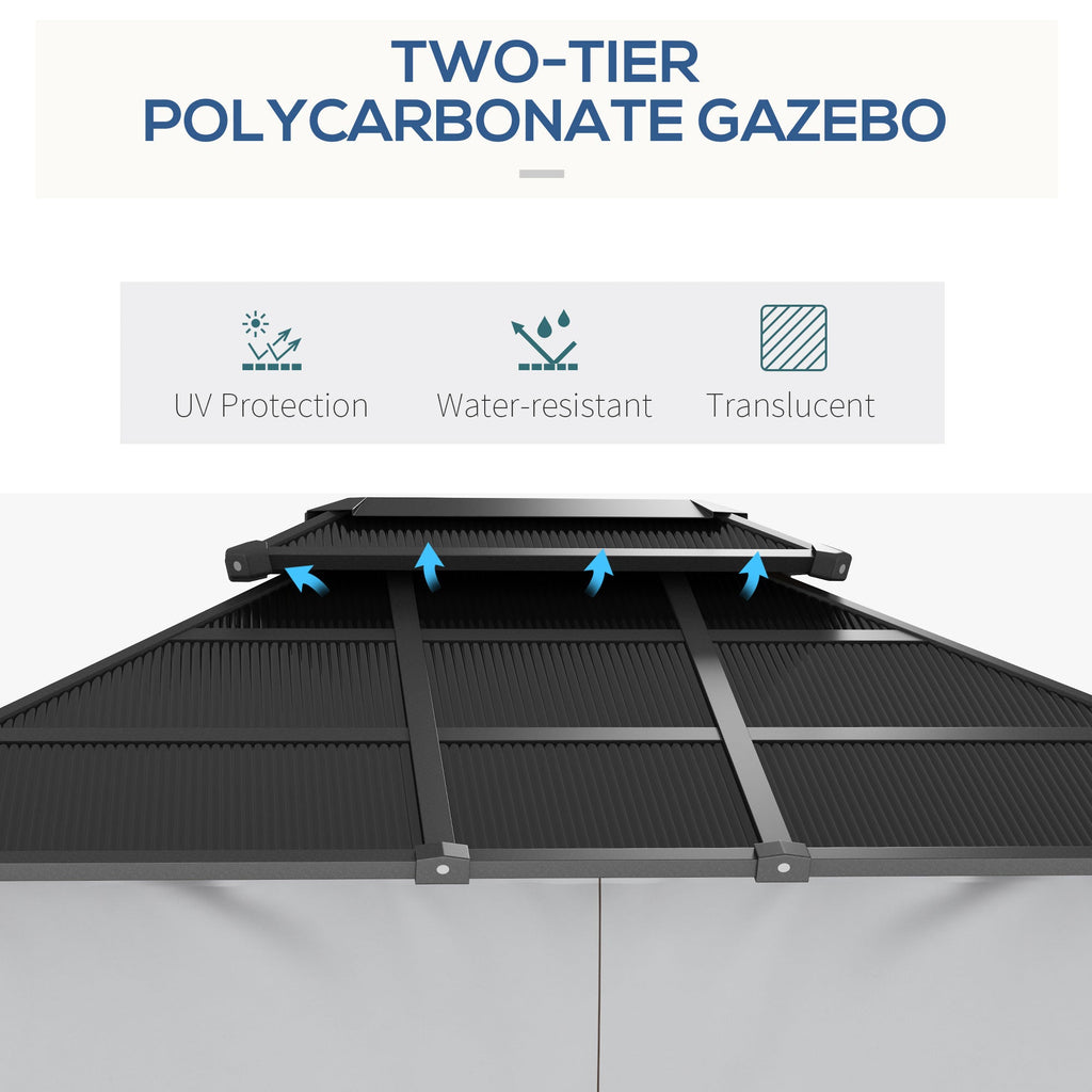 Create the perfect outdoor retreat with this two-tier canopy gazebo. Featuring a lightweight, translucent polycarbonate roof, it protects you from UV rays and rain while allowing natural light to filter through. Enjoy fresh air and visibility while staying shielded from the elements. Constructed with a rust-proof aluminum frame and heavy-duty metal components, this gazebo is designed for durability and stability. It includes eight ground stakes for soft soil and eight anchor bolts for hard surfaces, ensuring the gazebo remains securely in place. The mesh netting keeps unwanted insects at bay without obstructing airflow or your view, and the curtains offer additional sun protection or privacy when needed. With ample space of 9.2' high, 11.8' long, and 9.8' wide, it’s the ideal addition to your patio, pool, or hot tub area for hosting guests and making memories.
