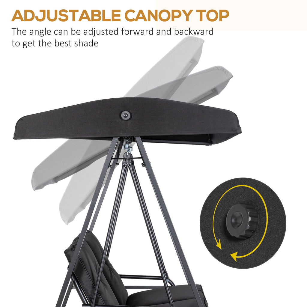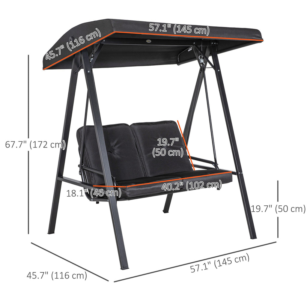 Enjoy the perfect outdoor relaxation experience with this stylish 2-seat patio swing with a canopy. Designed to comfortably accommodate two people, this swing features a thickly padded seat that enhances comfort for long hours of lounging. The arc-shaped, tilt-adjustable canopy offers optimal shade and protection from the sun’s harmful UV rays, ensuring a cool and enjoyable seating area. Built for durability, the swing chair is supported by a sturdy steel frame with a powder-coated finish, making it strong enough to hold up to 484 lbs. Whether placed in the garden, backyard, patio, deck, or lawn, this freestanding swing blends seamlessly with any outdoor setting. Its easy-to-clean polyester cushions add a touch of luxury while ensuring maintenance is hassle-free. With an overall dimension of 57 inches in length, 45.75 inches in width, and 67.75 inches in height, this swing provides a stable and stylish seating solution for outdoor leisure.