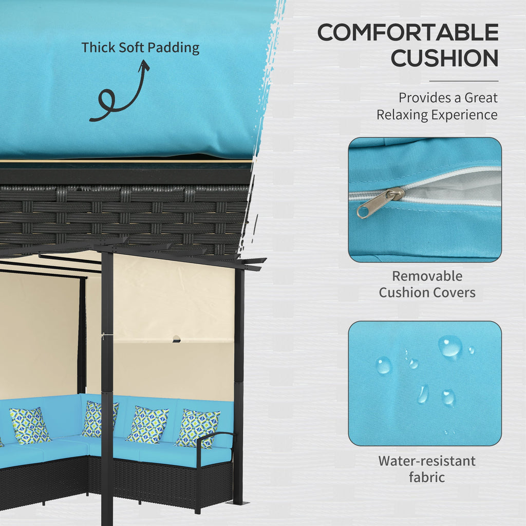 Elevate your outdoor lounging experience with our contemporary rattan sofa set, designed for comfort, style, and functionality. This versatile outdoor furniture set includes a spacious three-seater sofa, a cozy double sofa, and a stylish pergola to create a perfect environment for relaxation and socializing. The pergola comes equipped with a PA-coated polyester awning that provides UV protection, ensuring you enjoy sunny days without worrying about sunburns. Its adjustable top cloth allows you to customize the shade, and with eight support stakes included, the pergola is securely mounted on soft ground. The set is constructed with a galvanized steel frame and powder-coated process for durability, while the handwoven PE wicker provides long-lasting strength. The padded cushions and soft back pillows add a cozy touch to your outdoor space, and the removable cushion covers make cleaning and maintenance simple. This rattan patio furniture set is perfect for any outdoor setting, bringing together style, comfort, and practicality.