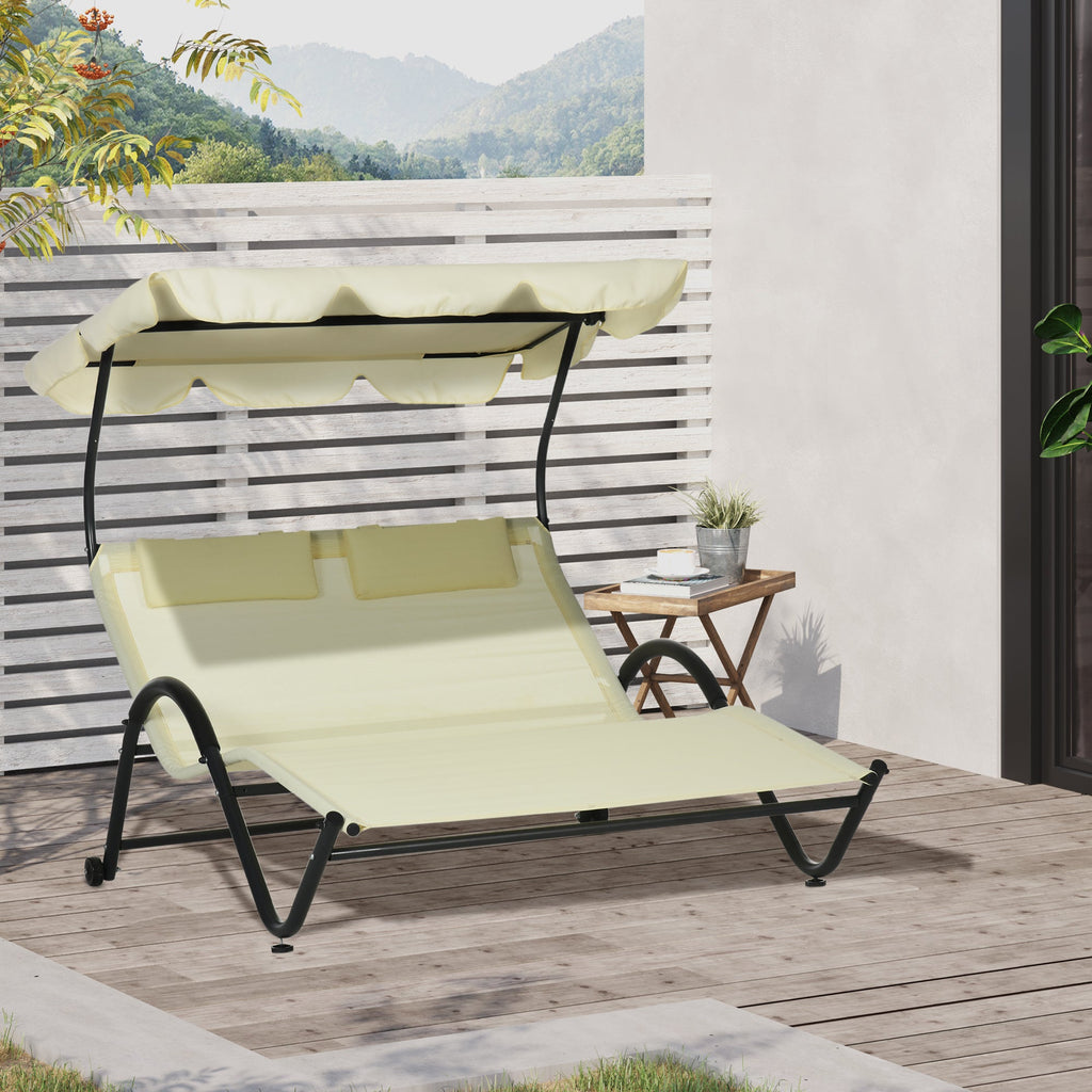 Enjoy the ultimate outdoor relaxation with this stylish double sun lounger, designed for two people to lounge in comfort. With its modern and ergonomic design, this chaise longue provides a luxurious addition to any patio, garden, or poolside setting. The adjustable sunshade roof with a ruffle edge offers optimal protection from harmful UV rays, keeping you cool while you soak up the sun. Whether placed on a deck, porch, balcony, or backyard, this lounger is perfect for summer relaxation. Designed for convenience, it features padded headrest pillows and sturdy armrests to enhance comfort, while the built-in wheels allow for easy mobility so you can roll it to your preferred sunbathing spot. The lounger is built with a durable, rust-resistant steel frame with a powder-coated finish, ensuring long-lasting stability and strength. The breathable sling mesh fabric provides excellent comfort and ventilation, making it ideal for extended lounging sessions. With a weight capacity of 484 lbs (220 kg) and overall dimensions of 78.7" W x 53.9" D x 54.3" H (200 x 137 x 138 cm), this sun lounger offers a spacious and durable seating solution for your outdoor relaxation needs. Assembly is required.
