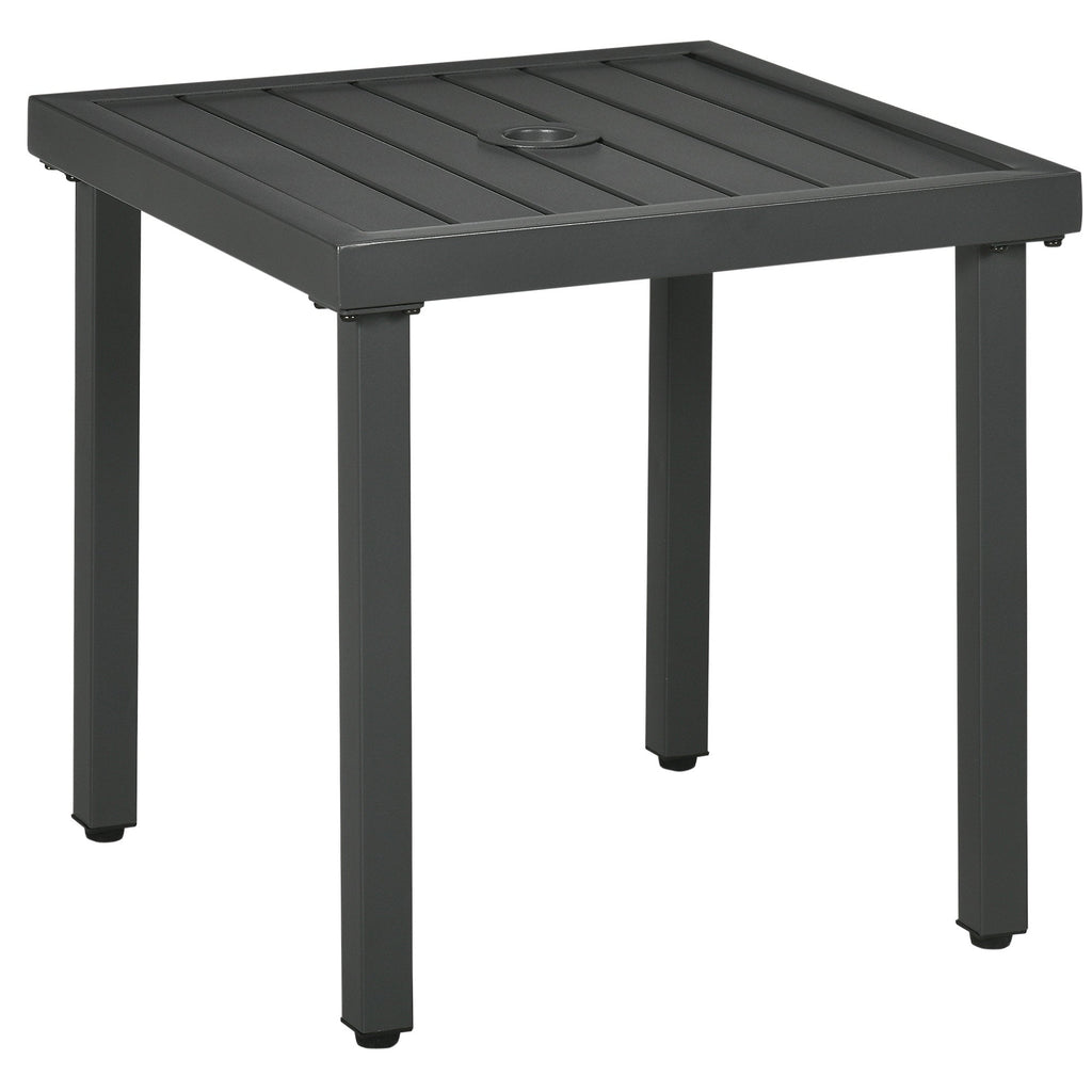 This compact and functional outdoor accent table is perfect for small spaces, offering ample room to place books, drinks, snacks, or flowers. Its sleek design ensures you can enjoy your outdoor activities without worrying about where to place your items. The table features a Φ1.8" (45mm) umbrella holder in the center, allowing you to securely place a parasol (umbrella not included) for sun protection. Anti-slip adjustable foot pads keep the table stable on uneven surfaces and protect your floors from damage. Crafted with a durable steel frame and a powder-coated finish, this outdoor-ready table is built to withstand the elements, making it a great addition to your patio or garden.