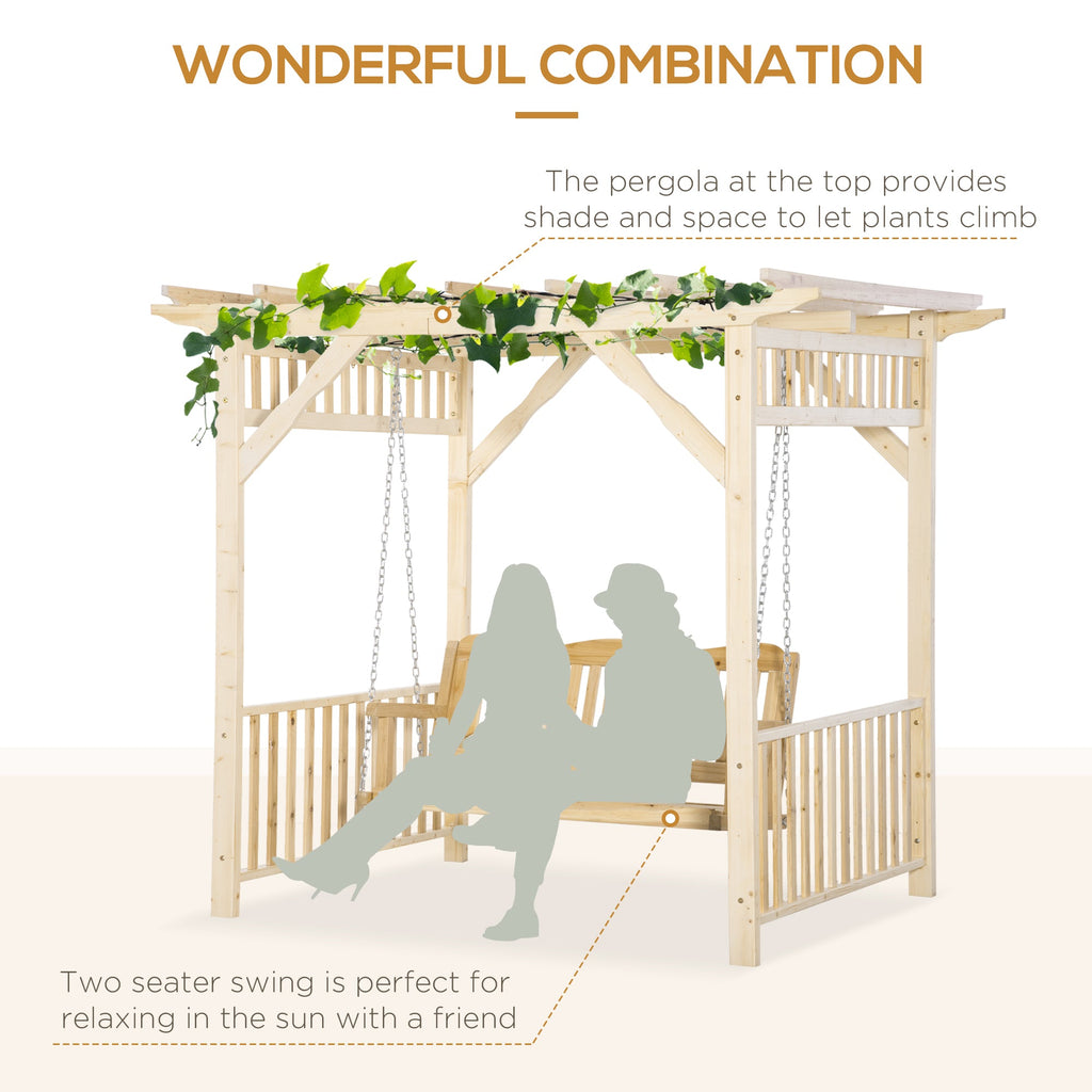 Enjoy your outdoor space in style and comfort with this elegant two-seater swing. Perfect for relaxing in the sun with a friend or lounging alone, this swing provides a refined look that enhances any backyard, patio, or garden. The unique pergola structure at the top of the swing offers shade while allowing climbing plants to add a touch of nature, creating an inviting and ambient atmosphere in your outdoor living area. Designed for stability, this swing features four solid wood feet that ensure it stands securely, eliminating concerns about wobbling or instability. The high back and slatted armrests provide maximum comfort, making it easy to relax for hours. Whether you’re enjoying a quiet moment or entertaining guests, this swing is the perfect addition to your outdoor furniture collection.