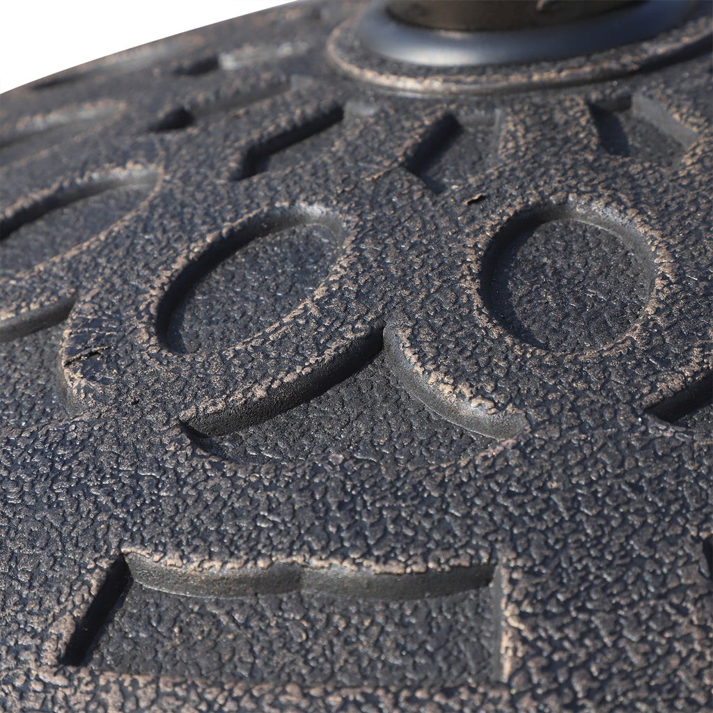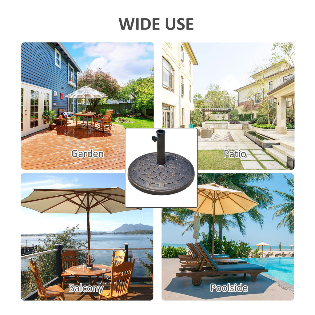 Add both function and style to your outdoor space with this elegant and durable umbrella base. Designed to fit umbrellas with a pole diameter of 1.5" (3.8 cm) or 1.9" (4.8 cm), this stand ensures a secure and steady foundation for your patio umbrella. Equipped with a hand-tightening rotary knob, you can easily slide your umbrella into the base and turn the knob to confirm a snug and secure fit. The bottom of the base is made of high-quality resin, designed to resist chipping, peeling, and aging, while the steel pole provides reliable support, even in outdoor conditions. Featuring a decorative bronze-tone connecting circle pattern, this umbrella stand brings a chic, high-end touch to your garden, patio, or backyard. It’s the perfect combination of durability and elegance.