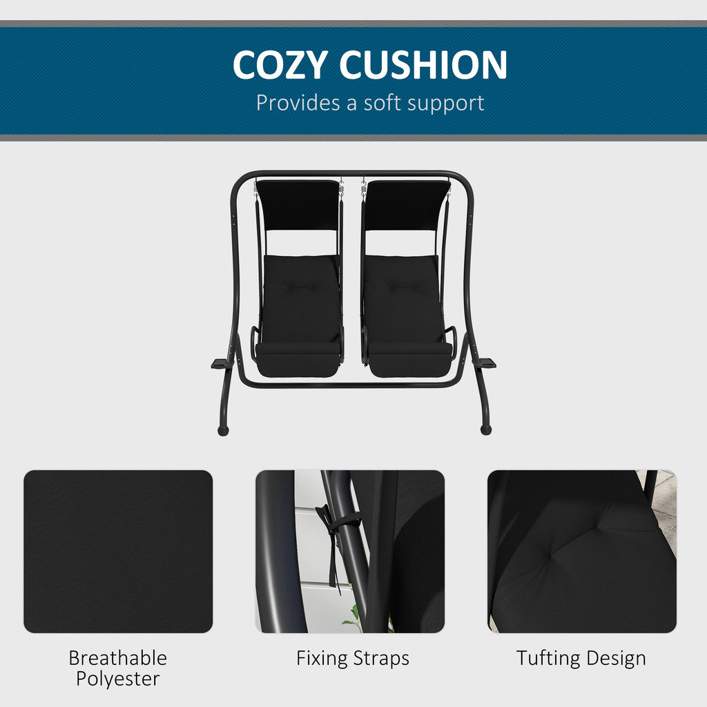 Upgrade your outdoor relaxation with this two-seater porch swing featuring independent cushioned seats for customized comfort. Each seat rocks separately and includes its own built-in handrails, allowing two people to swing at their own preferred pace. The wide canopy overhead provides reliable sunshade, keeping you cool and protected from harsh UV rays and glare. Designed for true comfort, each seat includes a soft cushion and cushioned backrest, along with built-in cup holders so you can enjoy your favorite beverages while you unwind. Crafted with a sturdy A-frame metal construction and anti-skid foot pads for added stability, this swing is ready for any patio, garden, or backyard retreat.