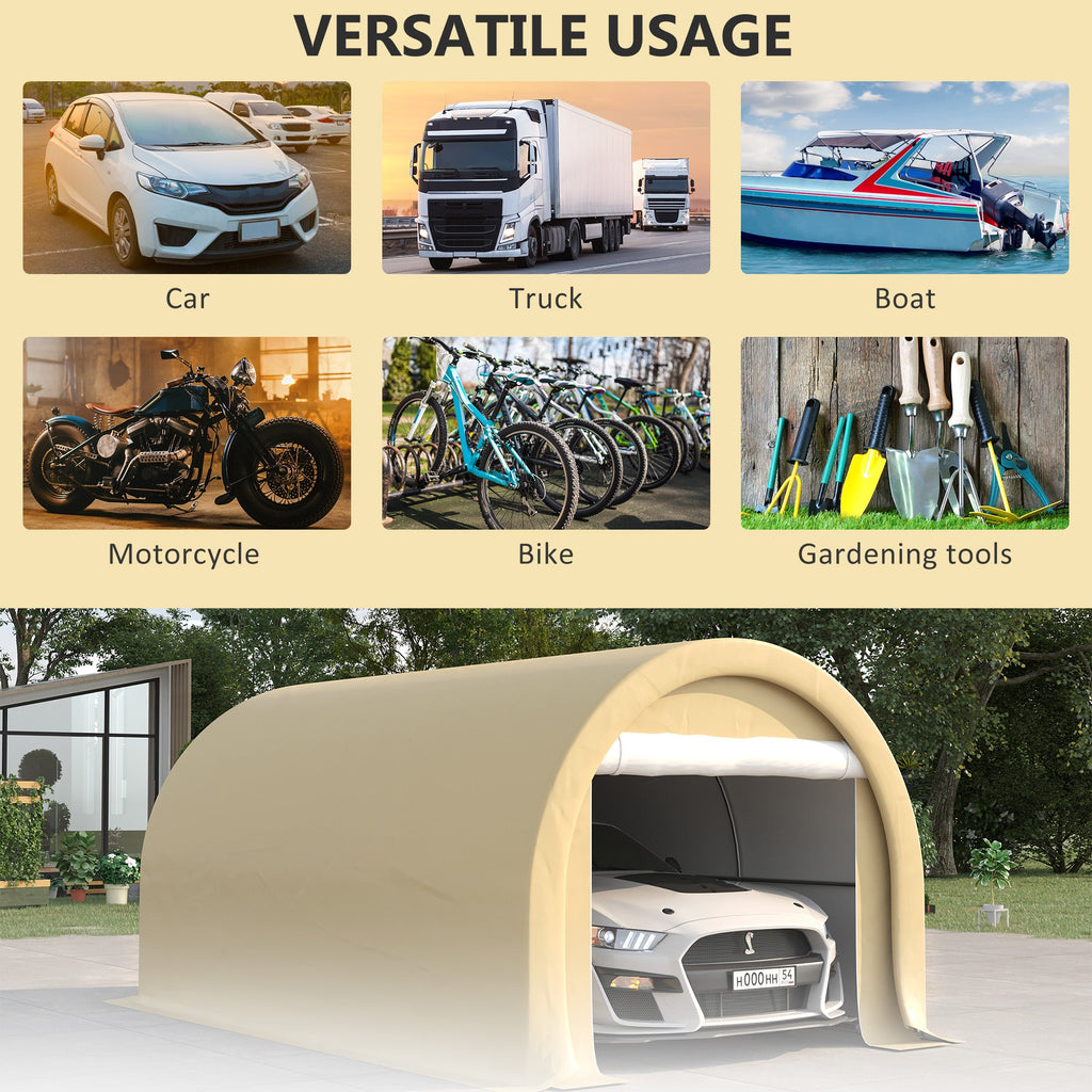 Protect your vehicle and outdoor equipment with this all-weather Carport Canopy Tent, designed for durability and convenience. The heavy-duty PE canopy cover shields your car from UV rays, light rain, dirt, and debris, while full sidewalls provide 360-degree protection. Easy to assemble with ratchet straps, this carport includes a removable zippered front door for effortless entry and secure closure. The frame is built from galvanized steel for enhanced strength and stability, supported by ground stakes and 7.9" extended edges that can be buried for added security. Versatile in function, this portable steel garage is perfect for storing not only vehicles but also gardening tools, outdoor furniture, or construction materials.