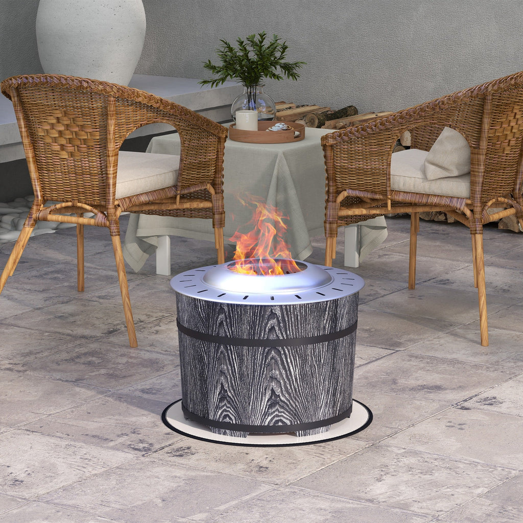 Enjoy the warmth of a cozy campfire without the irritation of smoke with this Smokeless Fire Pit. Designed for a clean-burning experience, it utilizes a secondary combustion process to eliminate most of the smoke—no more teary eyes or smoky clothes. Fresh air flows in from the bottom, heats up as it travels along the double-wall structure, and burns off the smoke before it escapes. Constructed with a rustic barrel-like shell made of durable magnesium oxide and a stainless steel combustor, this fire pit is built to withstand the elements while enhancing your outdoor decor. A fireproof aluminum foil mat is included for safe placement on grass, decking, or patios.