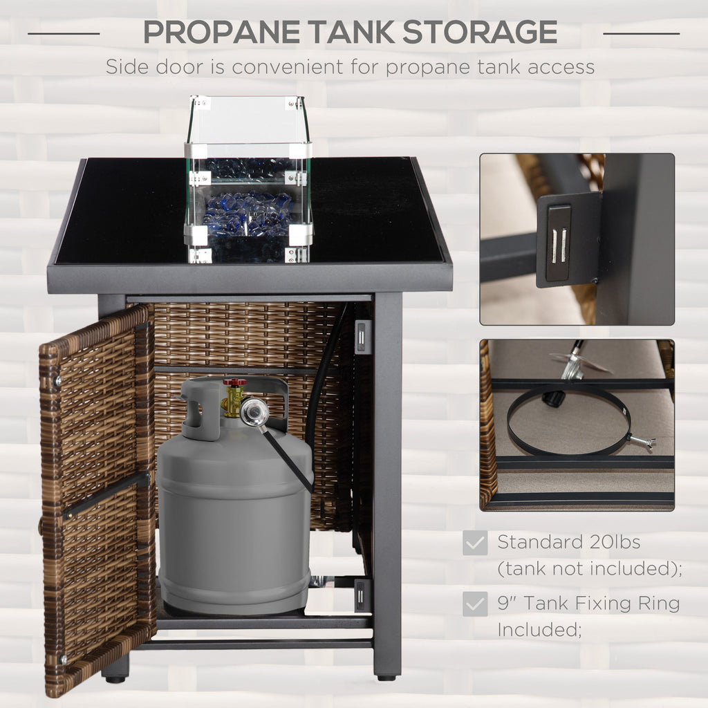 Create a warm and inviting outdoor atmosphere with this multi-functional patio fire pit table. Its rectangular design serves as a stylish centerpiece, doubling as a dining table, coffee table, bar, or casual conversation table. Certified by the CSA, the 50,000 BTU propane gas burner provides reliable and adjustable heat, igniting easily with a built-in electric pulse ignition system (AAA battery required). The included glass wind guard keeps the flame steady, while the side-access cabinet neatly conceals a standard 20-lb propane tank. Designed for durability and year-round enjoyment, this outdoor fire table features a powder-coated metal frame, weather-resistant PE rattan, and a sleek tempered glass tabletop—perfect for enhancing your garden, patio, or balcony with both function and flair.