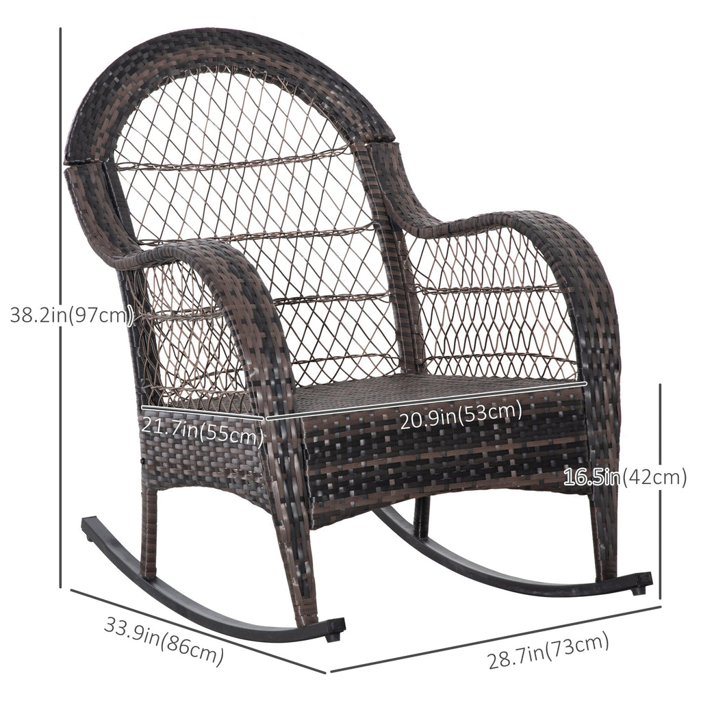 Enjoy a perfect blend of style and comfort with this high-end indoor and outdoor rocking chair. Designed with spacious seating for ultimate relaxation, it offers a smooth rocking motion ideal for use in the living room, garden, patios, backyards, or poolside. The stable base ensures a gentle rocking experience, and curved plastic foot pads act as swing limiters for added safety. The chair is outfitted with curved armrests, an extra-deep back-support cushion, and a thick seat cushion, all contributing to a luxurious seating experience. The cushions feature removable zippers for easy cleaning, while being durable and long-lasting. Built to withstand the elements, this rocker chair is constructed with a rust-resistant powder-coated steel frame for high stability and durability, and it is wrapped in hand-woven PE rattan wicker. Whether you're relaxing indoors or outdoors, this stylish and functional chair offers hours of cozy lounging.