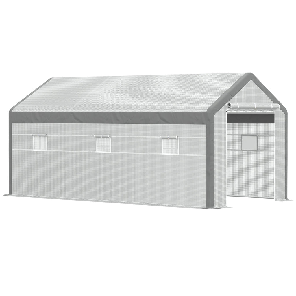 Extend your growing season and protect your plants from cold, wind, light rain, and birds with the Large Walk-In Greenhouse. This outdoor garden greenhouse is designed to create the ideal environment for your plants. Featuring two zippered roll-up doors at the front and back, you can easily access and transport plants or gardening tools. With 6 roll-up windows, the greenhouse promotes better air circulation and provides convenient observation windows to monitor plant growth. The fully enclosed, waterproof, and UV-resistant PE cover ensures that high humidity levels are maintained for tropical plants, while still allowing nourishing sunlight to pass through. The 15 cm extended edges of the cover should be buried in the soil for added stability and protection against rainwater accumulation. Built with a sturdy, powder-coated steel frame, the greenhouse offers excellent durability, while the included guy ropes and ground nails ensure it stays securely in place. With generous dimensions of 19.7'L x 9.8'W x 9.2'H, this greenhouse is perfect for gardeners looking to maximize their outdoor space.