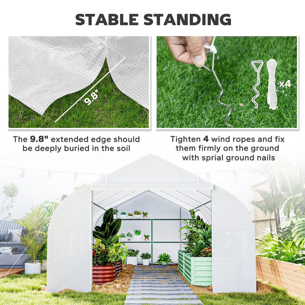 Extend your growing season and protect your plants with the Large Walk-In Greenhouse. This garden greenhouse is designed to help you efficiently manage your plants while shielding them from extreme temperatures. With two installation options, you can set the greenhouse on a hard surface or anchor it into soft soil for added stability. The greenhouse is built with a heavy-duty steel frame featuring a galvanized finish, 1" (25mm) diameter poles, and extra reinforcement with seven crossbars, four slant bracing tubes, and a front crossbar for enhanced strength. The transparent PE plastic cover protects your plants while allowing nourishing sunlight to pass through. It is easy to attach to the frame using included tethers and single-sided tape. For optimal ventilation and climate control, the greenhouse features eight roll-up side windows with mesh netting, as well as a large roll-up front entrance with a zipper for easy access. The greenhouse can be secured to the ground with four screw ground stakes and four supporting rods. Note: To prolong the lifespan, it is recommended to reinforce the greenhouse before bad weather conditions such as strong winds, rain, snow, or hail.
